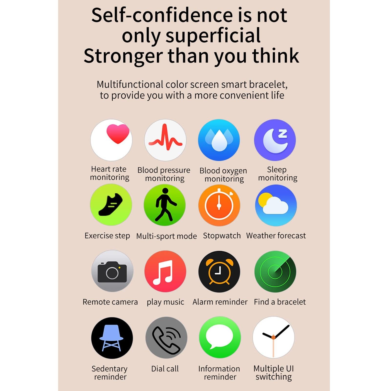 • Functions include call, SMS, WeChat, and QQ reminder push, exercise tracking, sleep monitoring, sedentary reminder, calorie calculation, stopwatch, heart rate and blood pressure monitoring, vibration, exercise mode, remote camera, music control, smart alarm, weather forecast, multi-dial switching, and more