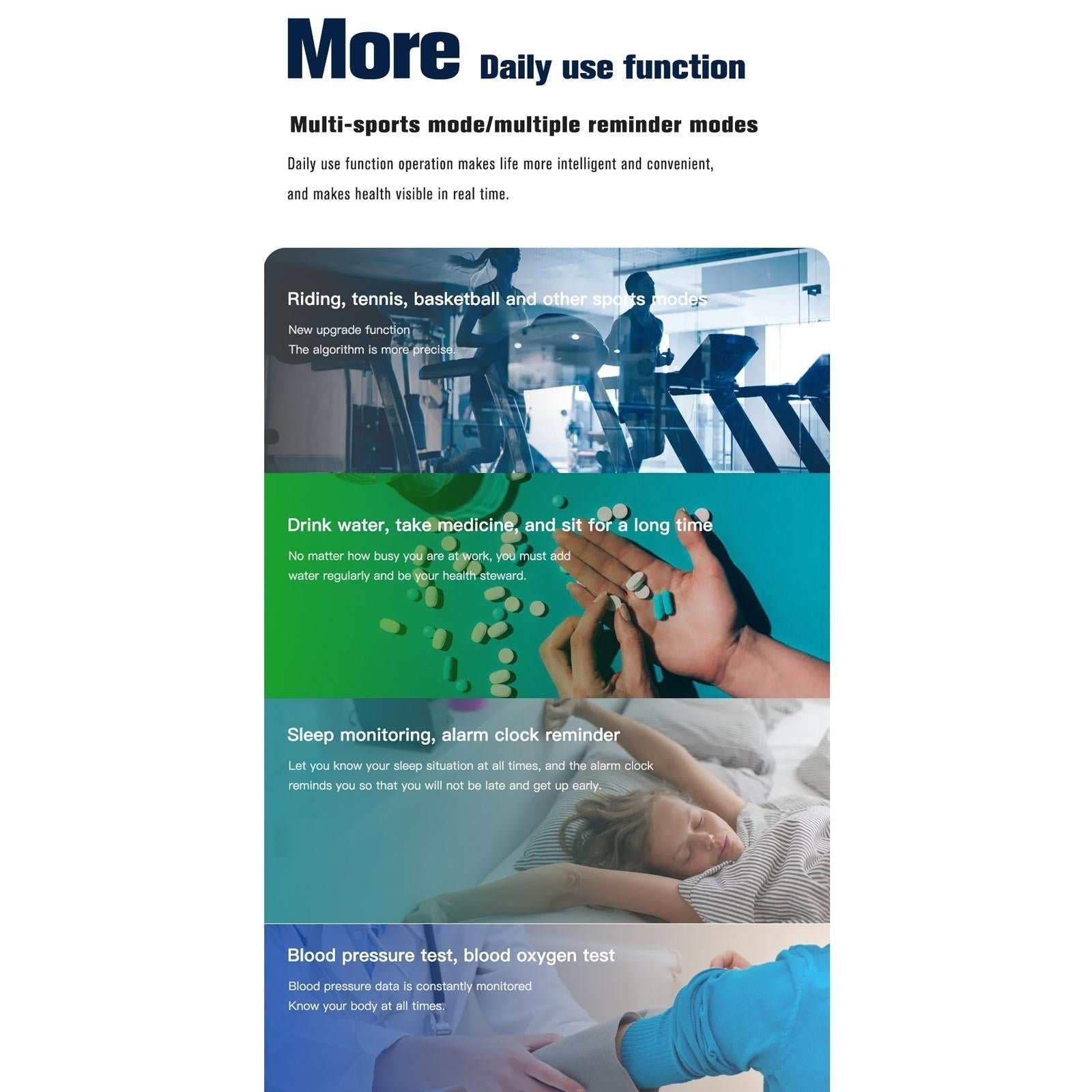 • Body temperature, sleep, heart rate, blood pressure, blood oxygen, pedometer, distance, calories, stopwatch, and multi-sports mode (running, cycling, swimming, mountain climbing) monitoring