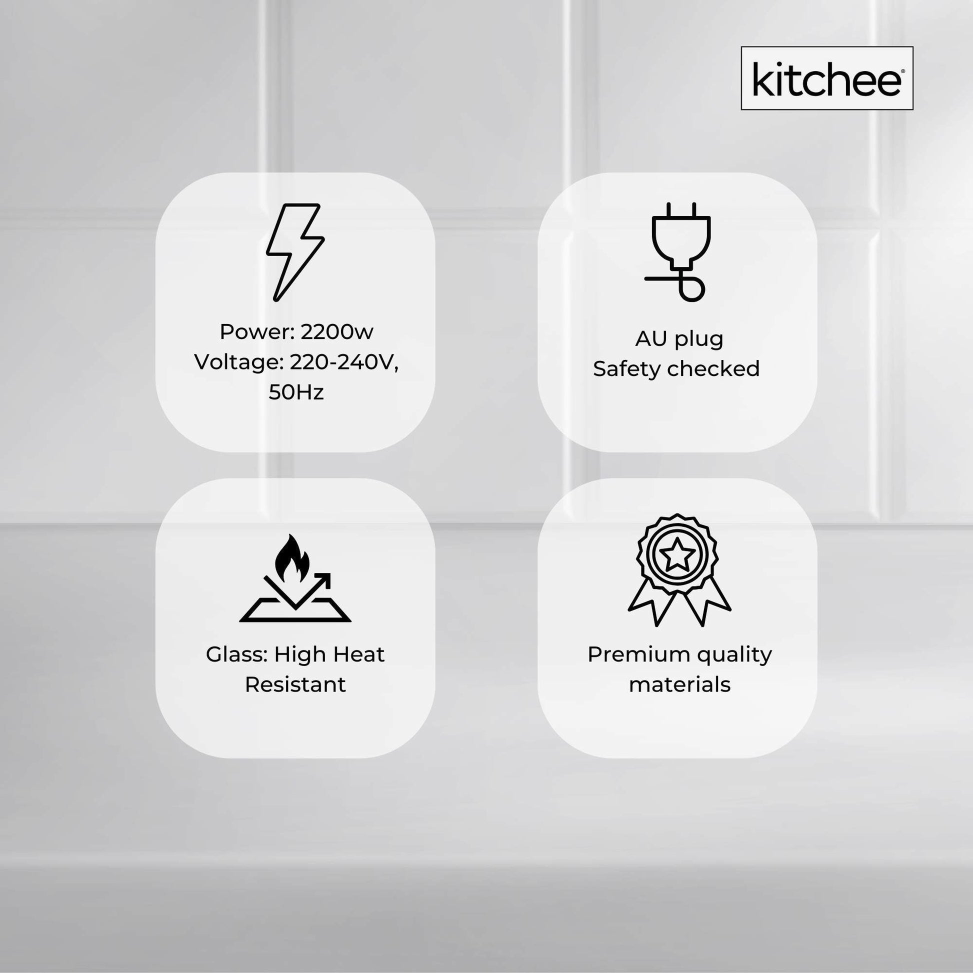 This timeless, elegant and stylish full glass kettle by Kitchee, does not just add a contemporary LED spark to your kitchen, but delivers a much healthier way to make a cuppa in quality heat resistant high pressured glass.