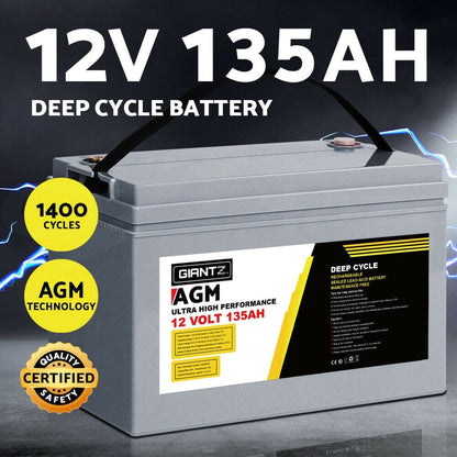 The GIANTZ 135Ah Deep Cycle Battery delivers reliable off-grid power for 12V systems in 4WDs, caravans, campers, trailers, motorhomes, and marine environments. Designed for applications like portable fridges and washers, this battery offers an impressive lifespan of up to 1400 cycles. Its advanced AGM technology enhances electrolyte absorption, improves cyclic stability, and supports frequent charging without compromising performance, ensuring consistent, long-lasting power whenever you need it.