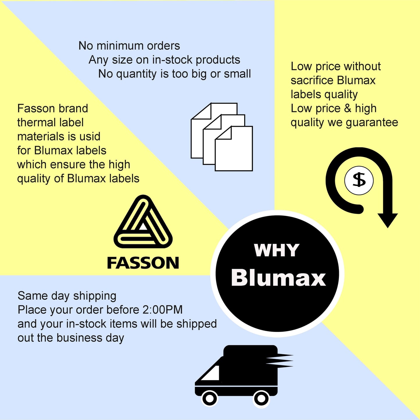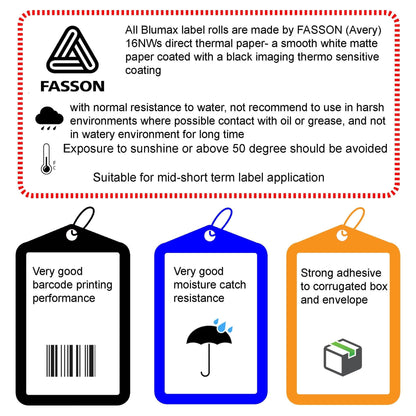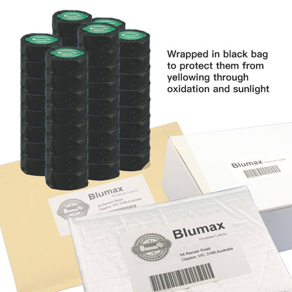 Blumax labels use Avery-Fasson Thermal Direct Material(16NWS/AP103/BG40#) as the label media which ensure high quality and reliable printing.Each labels measures 51 x 19 labels with each rolls.
