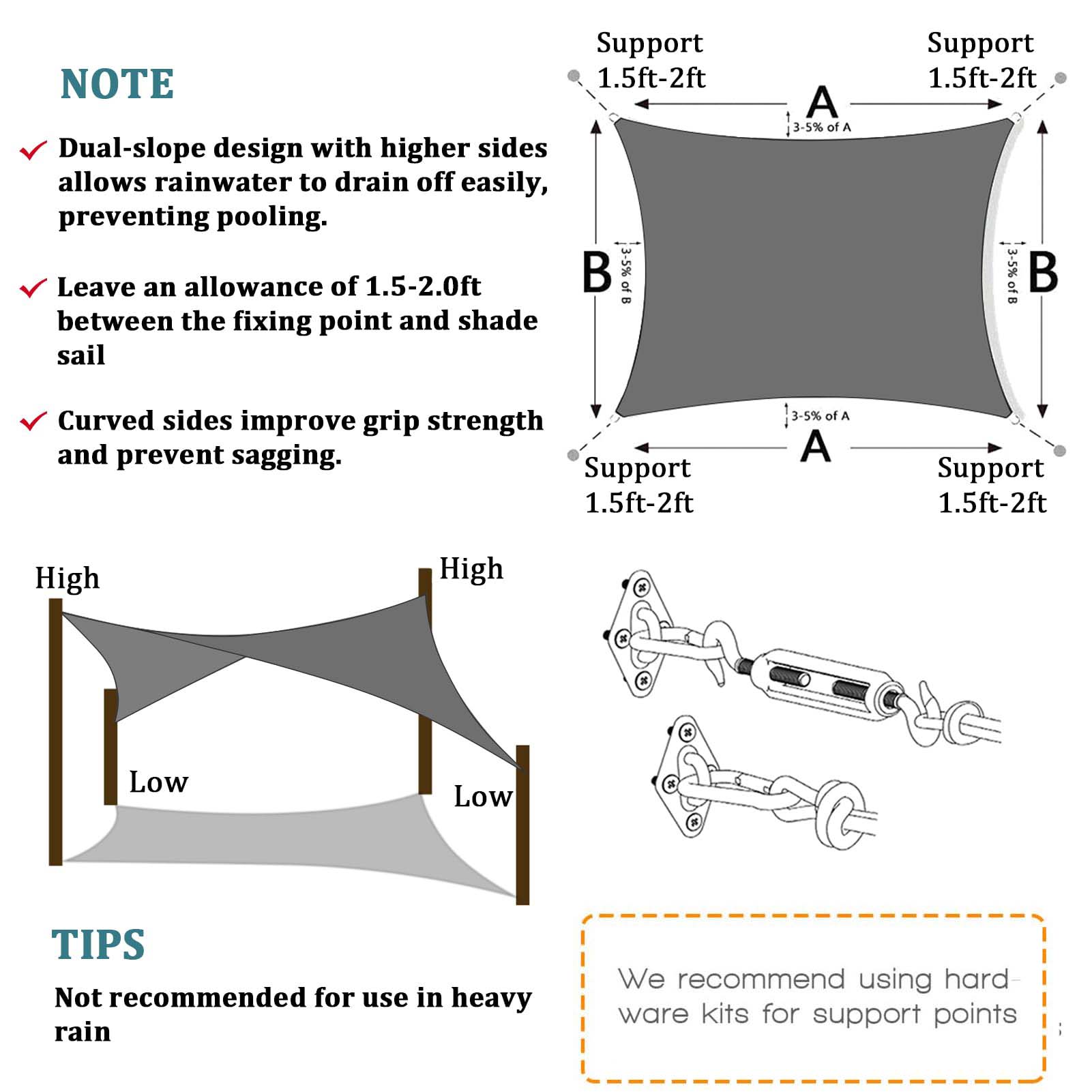 This sun shade is designed with curved edges to maximise tension; Every corner is sewed with 2 layers of nylon straps connected with a durable stainless steel D ring, to avoid rip or break off.