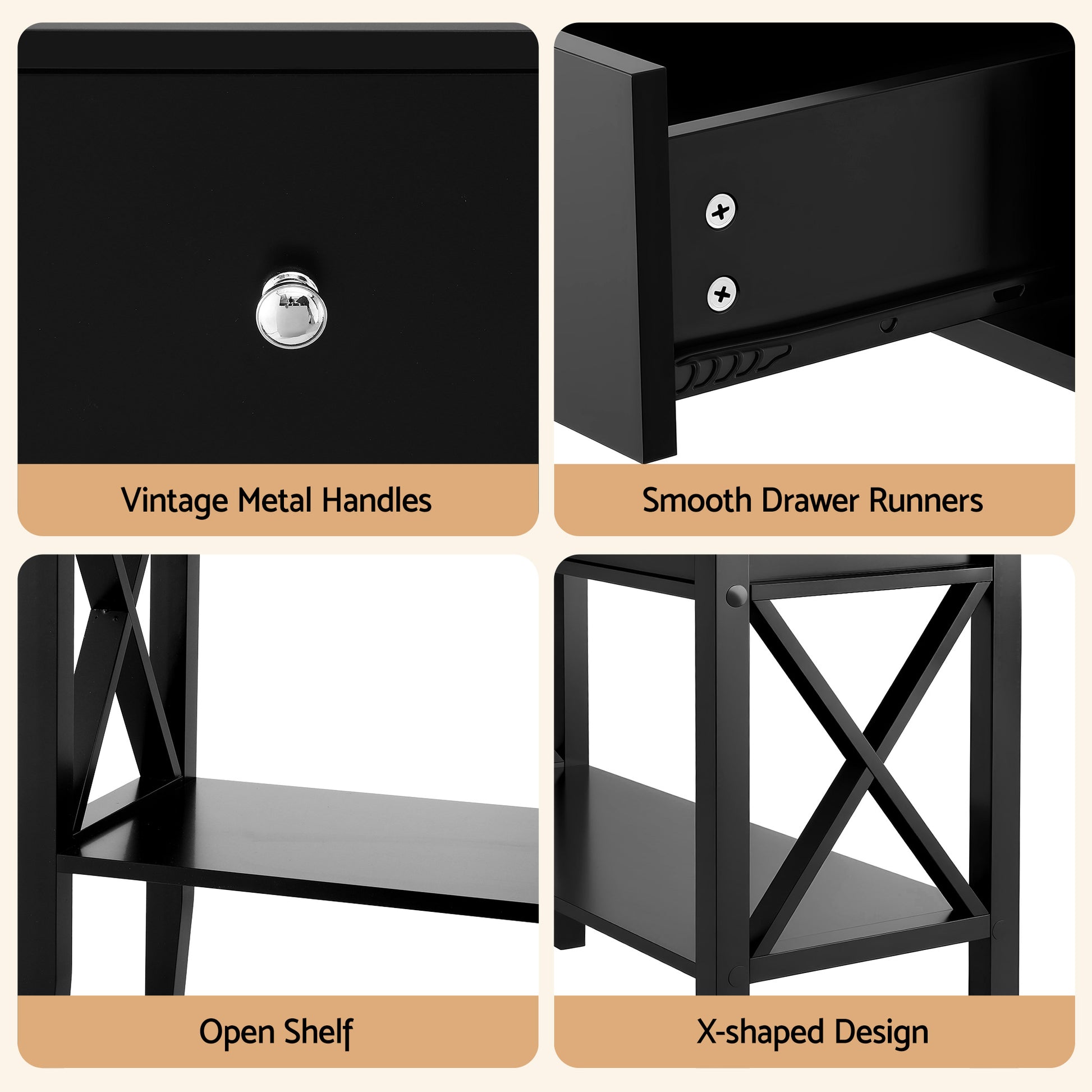 Bring stylish charm and modern function to any space with the Artiss Console Table. Featuring 2 spacious drawers with vintage metal handles, smooth runners, and anti-toppling device, this console table offers ample storage. Its 2-tier open shelf design suits entryways, living rooms, cafés, or salons. Easy to clean and maintain, it's perfect for everyday use.