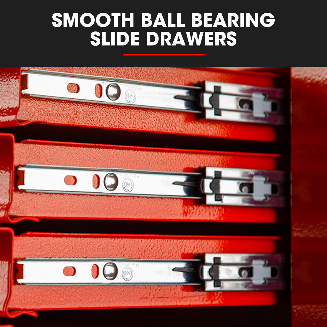 Both the cabinet and chest are built with high tensile powder coated steel enclosures. Equipped with an EVA mat, each drawer slides effortlessly in and out on smooth ball bearing rails, which makes finding and accessing each tool a cinch.