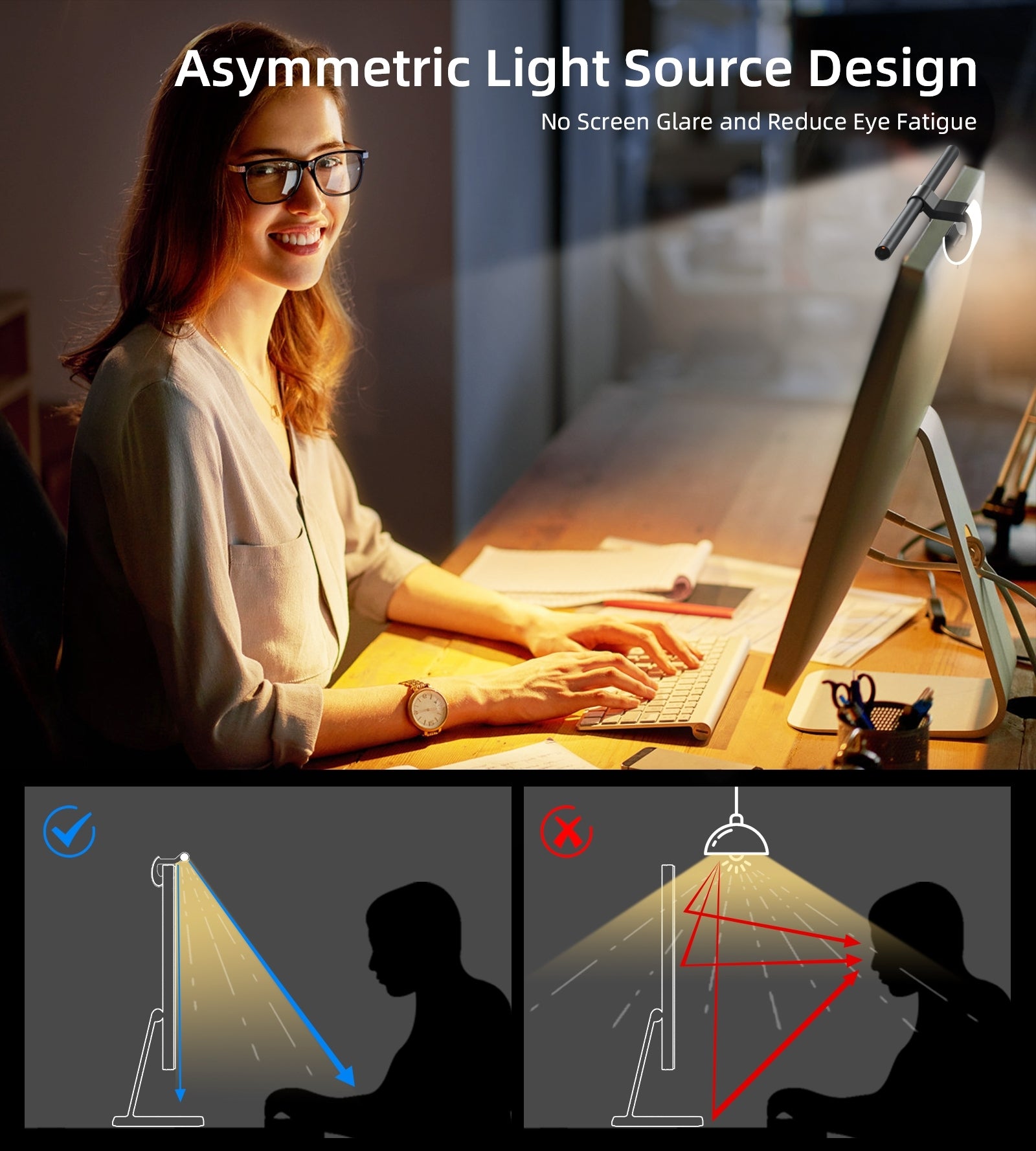 Thanks to the mounting on the monitor, the lamp perfectly illuminates only the working space on the desk. Due to the use of two sets of LEDs with different color temperatures, the emitted light has three colors.