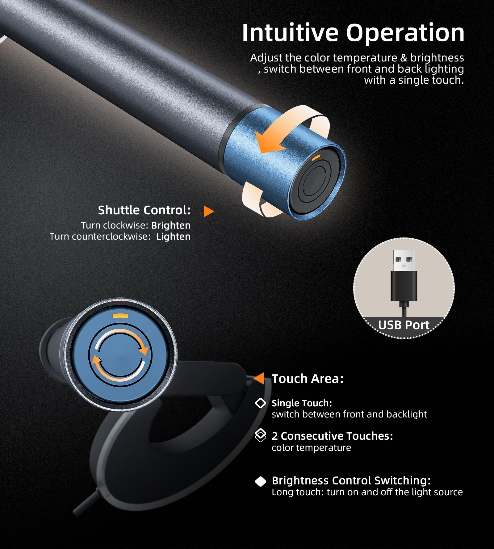 Light source type: Cold and warm dual-color LED Color redering index: RA>95 Adjustable color temperature: 2700K-6500K Illumination: >500Lux Light source: Front and Rear Lights Power input: 5V/1.4A Power Consumption: 7W Max Material: Aluminium alloy, Zinc alloy, ABS