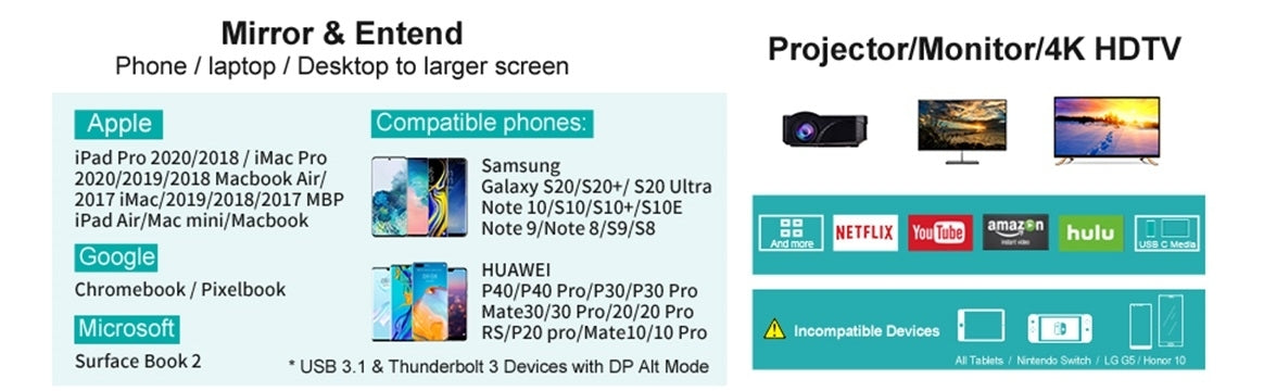CHOETECH USB C to HDMI cable works well with USB-C 3.1 port (Thunderbolt 3 compatible) devices. Widely use in any where you need.