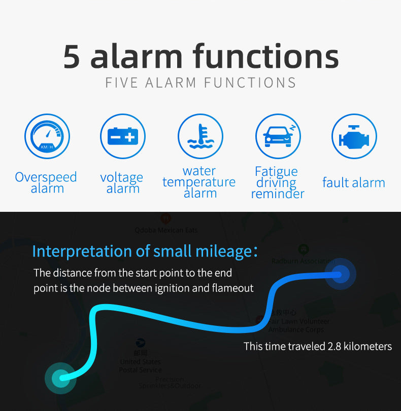 - Alarm Functions: Overspeed, Voltage, Water Temp, Fatigue Driving, Fault Alarm