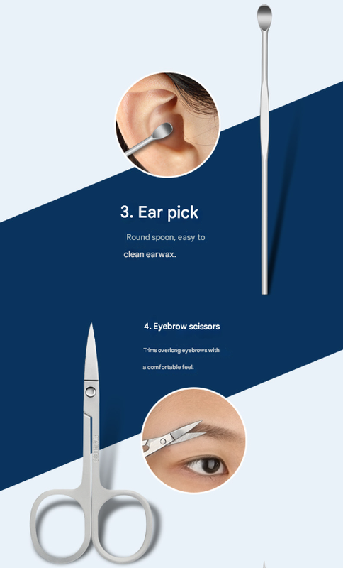 - Comprehensive 8-Piece Kit: Includes eight high-quality tools for complete nail and personal care: two nail clippers, beauty scissors, tweezers, a nano-glass nail file, an ear pick, a cuticle tool, and a cleaning brush.