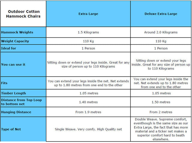 Our new Deluxe Extra Large Mexican hammock chairs are made with double material than our Extra Large Mexican hammock chairs. This extra material is incorporated in the Double stitched net adding extra support to your back. Making them even better than our amazing Extra Large range. I never thought that was possible to improve our Extra Large range but with we did with our Deluxe Range.