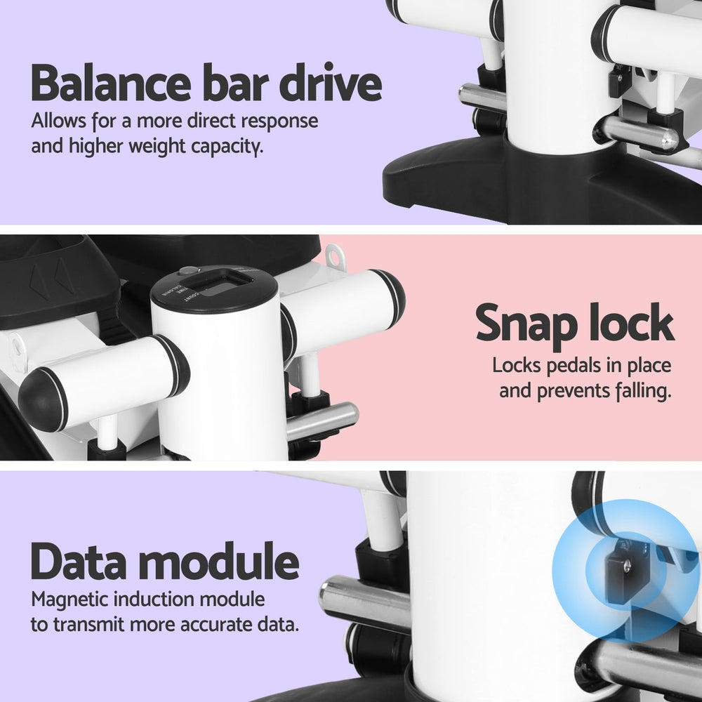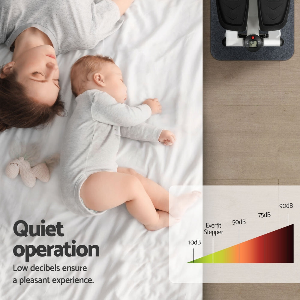 Step up your fitness game with a Mini Stepper from Everfit. Target your thighs, calves, waist and hips without leaving your home. The Mini Stepper is portable thanks to its miniature size, making it perfect for use under your desk, in the living room, or on the go. The stepper has an anti-slip pedal surface and edge for safety and stability, and your package includes a non-slip rubber mat to keep everything in its place. The stepper has a high weight capacity of 150kg and operates quietly for a pleasant exercise session that won’t disturb your guests or family. The LCD screen will show you all your fitness data as you exercise, and the detachable soft pedal pad is easy on your feet and easy to maintain. It requires no assembly and folds neatly away when not in use. Best of all, the stepper comes with two bonus resistance ropes so you can perform a variety of exercises. Get fit today from the comfort of your home or office with the versatile Everfit Mini Stepper.