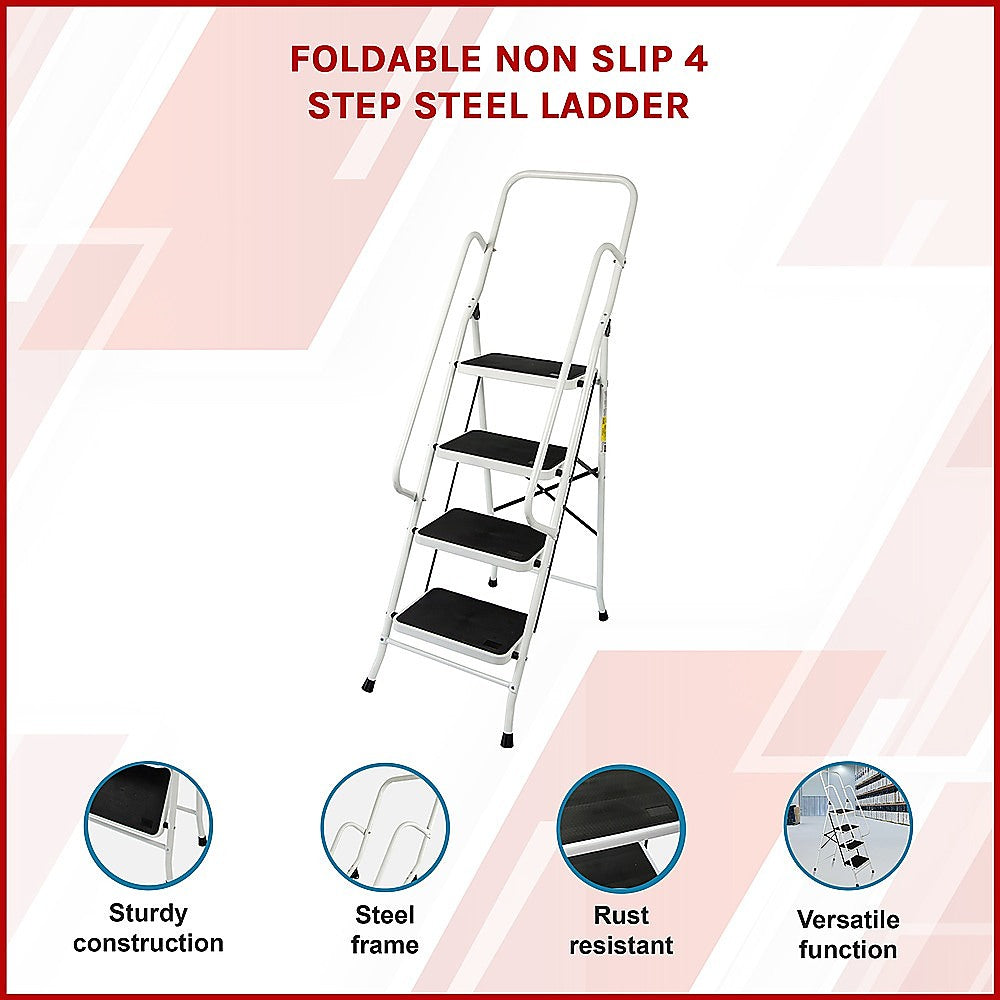 Safety features of this four-step ladder include non-slip steps with rubber surfaces and dual handrails. The step-ladder is foldable and lightweight and can be easily stowed away in a handy spot for quick access. You'll be surprised how often you'll need to use this great step-ladder for household chores.