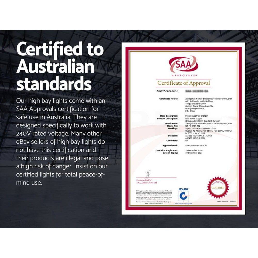 The lights also feature a honeycomb die-cast aluminum heat sink design for excellent cooling and heat dissipation for better efficiency. Not least, the high bay lights are SAA approved and certified to Australian standards.