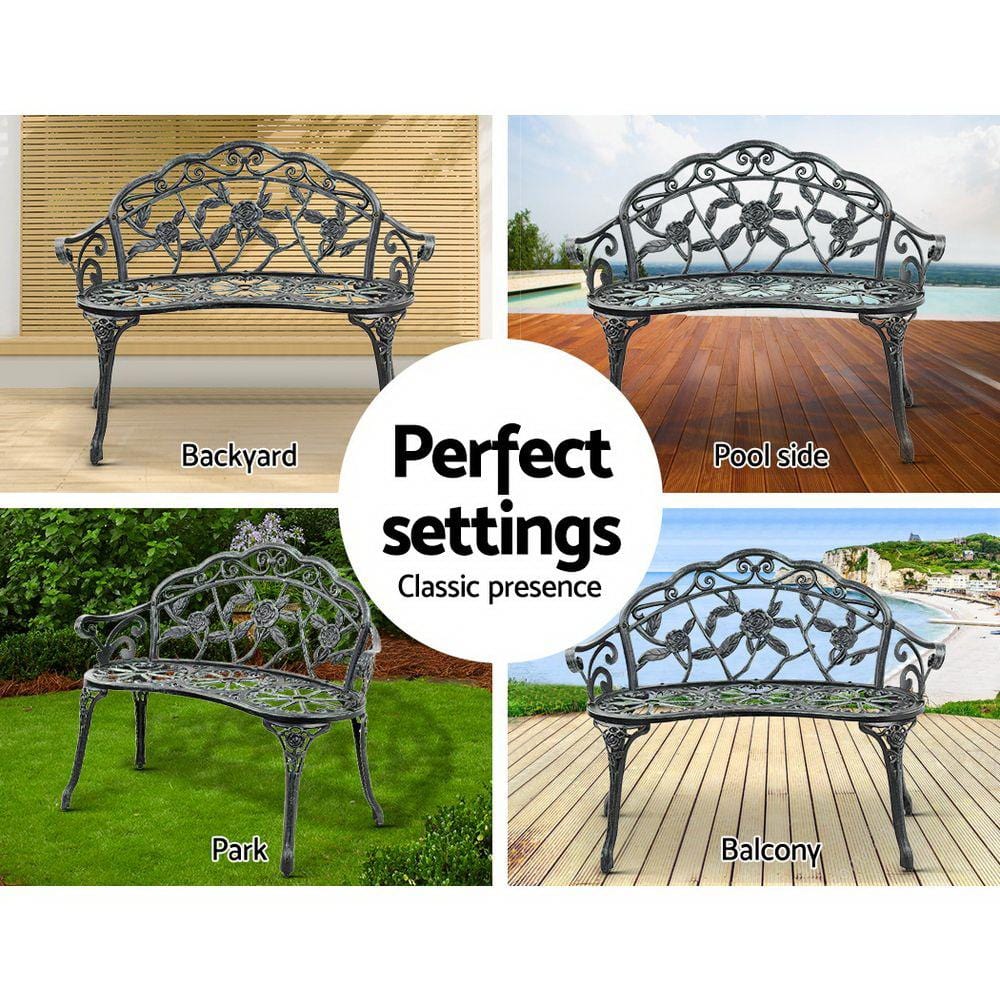 With its Victorian-inspired design, our Gardeon Garden Bench exudes vintage appeal in every way. From its ornate aluminium seat and floral-patterned backrest, the bench also features powder-coated cast iron legs for enhanced strength and stability. Better still, the wrought-iron look bench is also weather-resistant and rust-resistant. The bench is simply charming for use in any outdoor setting and has ample space for two persons with up to 220kg in maximum capacity.