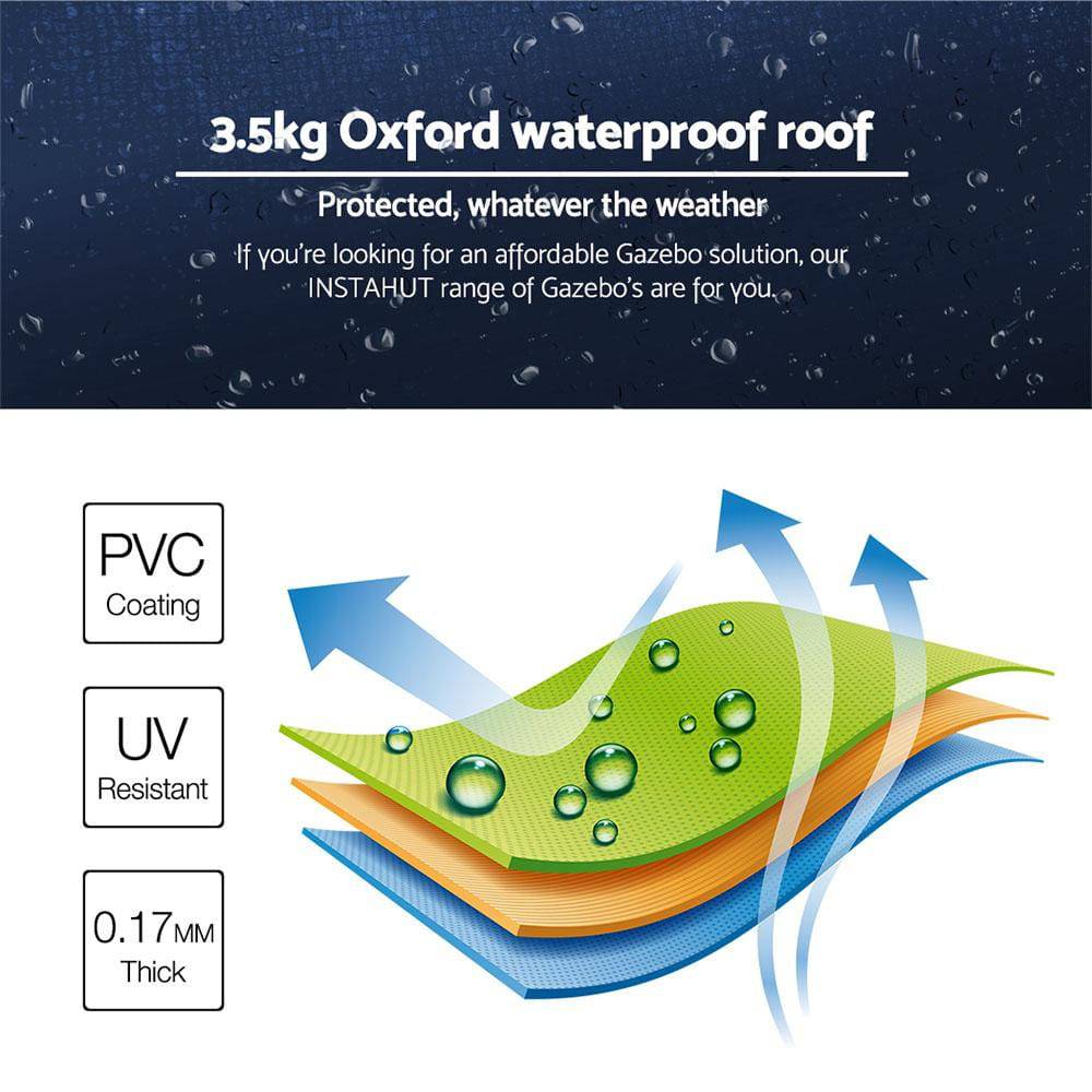 Made with a sturdy PU coating oxford fabric and treated for UV and water resistance, this INSTAHUT 3X3 Pop Up Gazebo offers a wide 300 x 300cm coverage for both ground and canopy. Ideal for various outdoor occasions, it can provide shade from the sun and protection from sudden downpours.