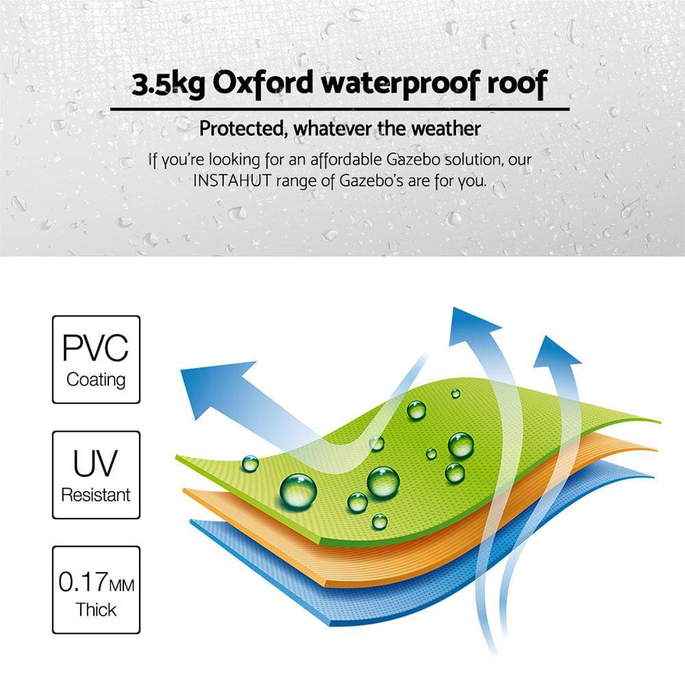 Crafted with durable high-density PU coating on oxford fabric and treated with effective UV and water repellent properties, the Instahut Gazebo Pop Up Marquee offers extensive coverage of 300 x 300cm. Whether you need shade from the sun or unexpected rain, this 3x3m folding tent is ideal for any outdoor event.