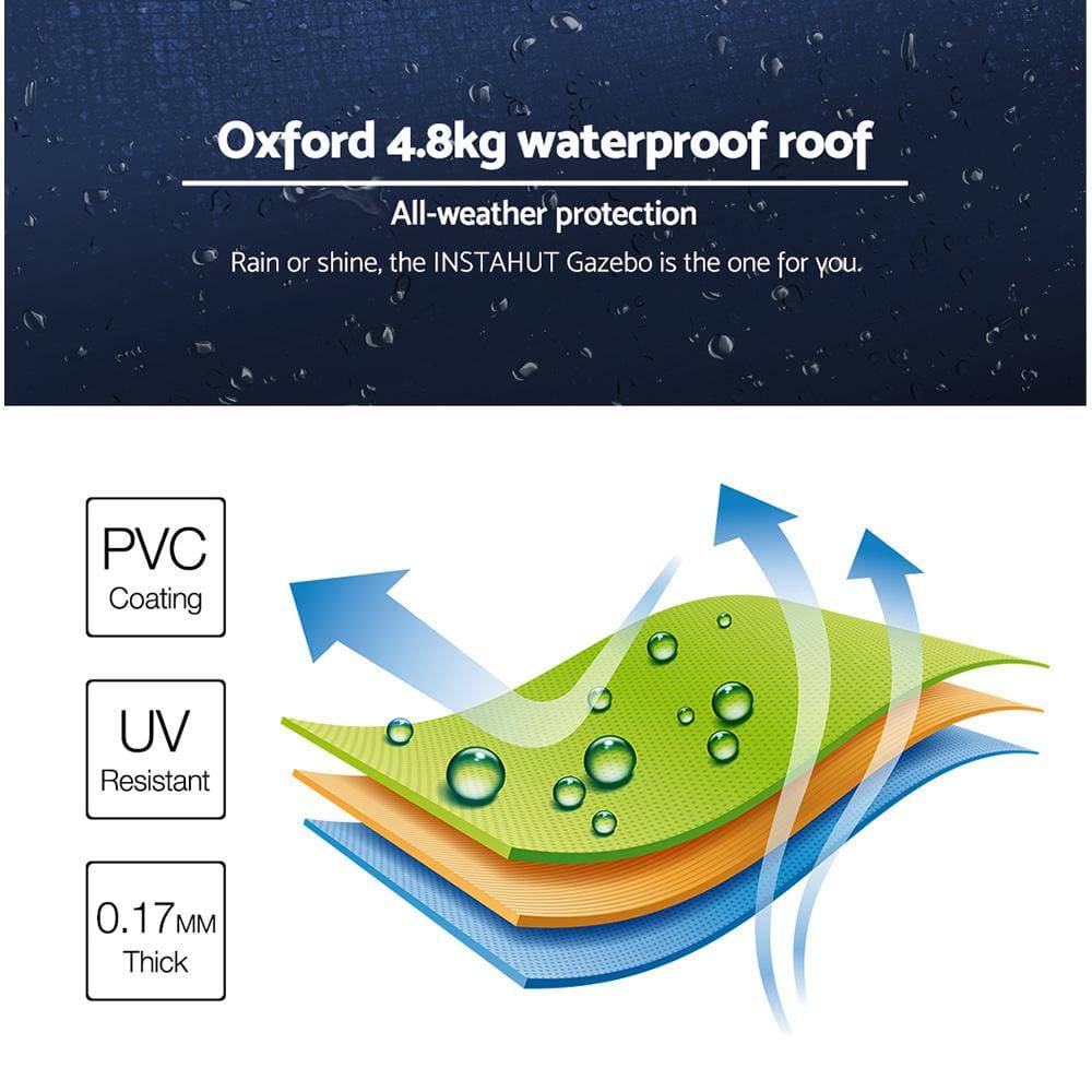 Constructed with PU-coated Oxford fabric, this INSTAHUT 3x4.5 m Pop Up Gazebo offers reliable UV and water protection. Measuring 300 x 450cm, it is ideal for various outdoor events and provides both shade and shelter. The sturdy steel frame, featuring strong legs and support struts, can be easily assembled and is built to last.