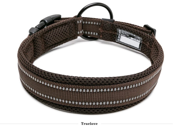 Heavy duty Dog collar. Never lose sight of your Dog in this stunning designed collar. It features a safety lock mechanism on the clip buckle to not cause stress when pulling. It is strong and comfortable and has an Stainless steel O ring providing a secure leash attachment point with 3M reflectors to improve visibility at night.