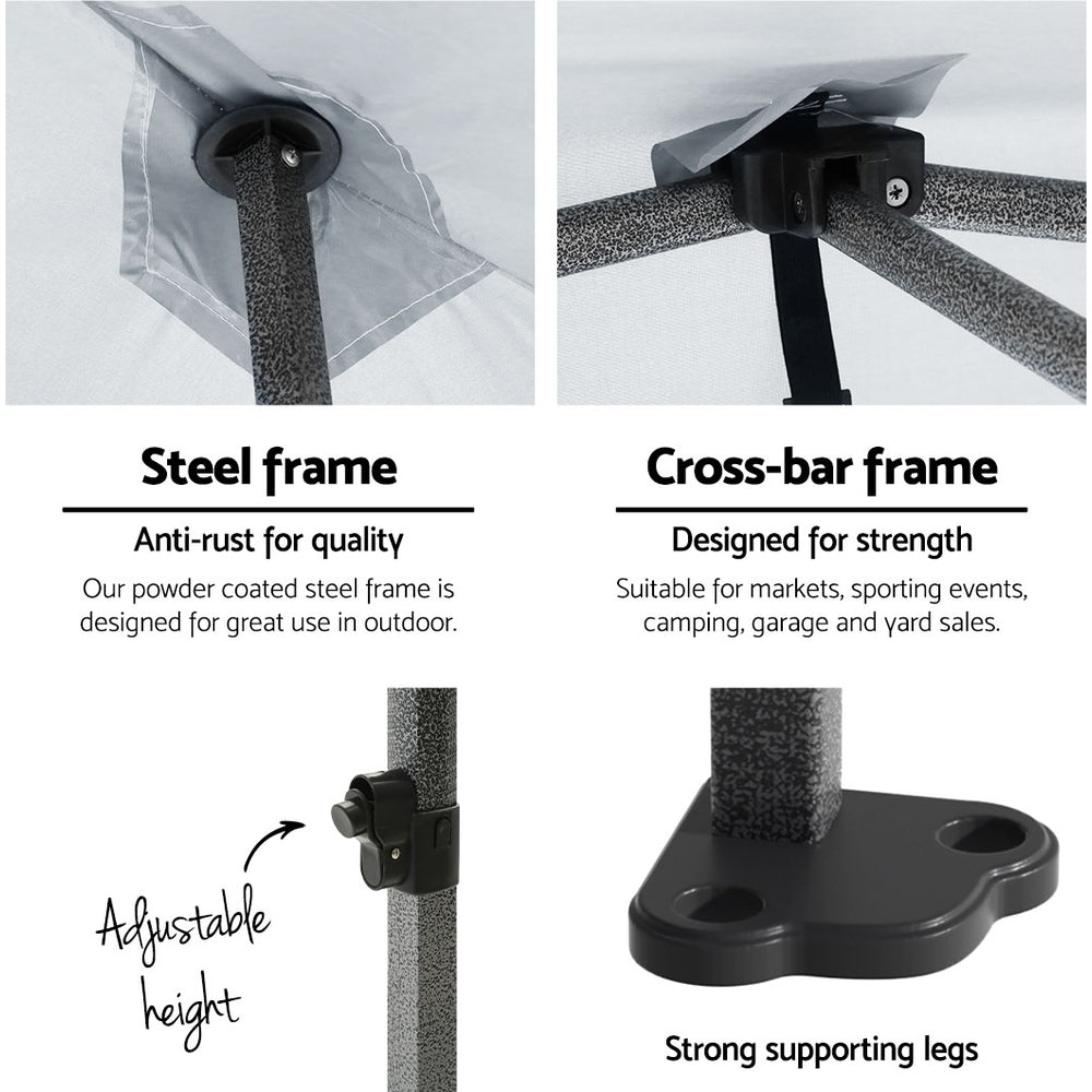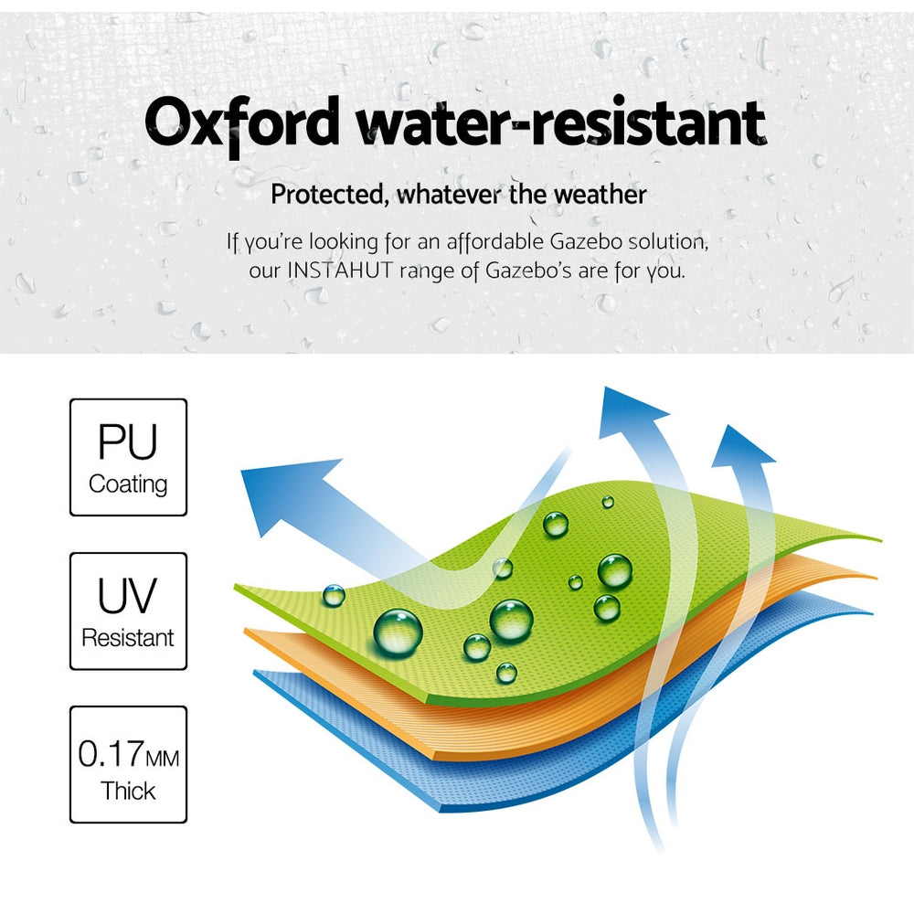 Constructed with durable PU-coated Oxford fabric and treated with UV and water repellent solutions, the INSTAHUT 3X4.5 Pop Up Gazebo provides ample coverage of 450 x 300cm. This versatile and strong structure is perfect for outdoor events, offering shade and shelter from unforeseen weather.
