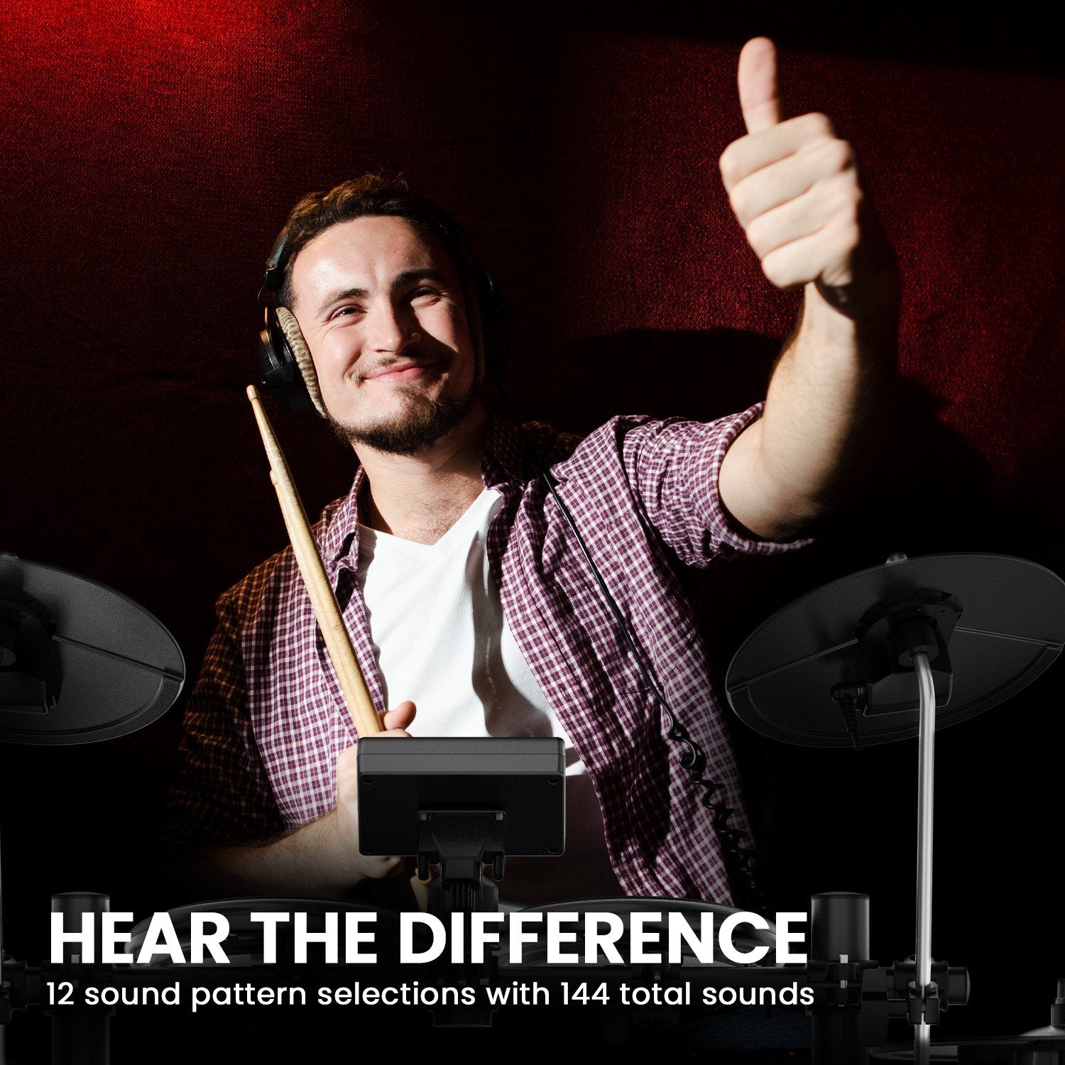- Bonus drumsticks, headphones and stool