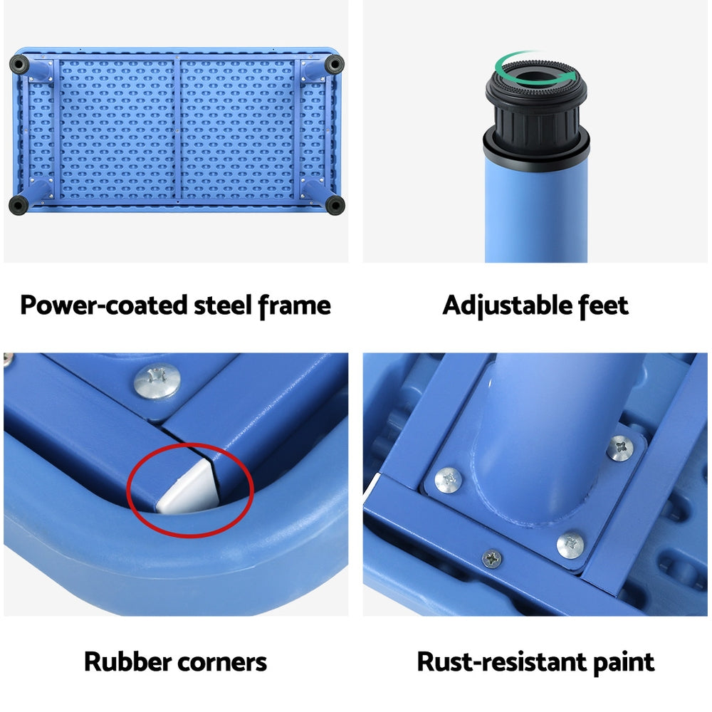 If your kids love getting creative, you'll love the Keezi Kids Activity Table and Chair Set. It may look like a simple setup, but with a powder-coated steel frame and high-quality HDPE plastic exterior, the set is built for heavy-duty, long-lasting use. The set is coated with rust-resistant paint, features upgraded rounded corners for safety and comes with 8 chairs for the perfect play date. The table has a 100kg weight capacity to hold everything your child needs, and each chair has a weight capacity of 50kg. Adjustable feet ensure the table is always the perfect height for your children to play, draw, read, write or craft. You can easily use the set indoors or outdoors – whatever the day requires. The chairs feature a stackable design so you can easily store them away at the end of the day. Best of all, the set is EN71 European Safety of Toys certified, so you can rest assured you made the right choice for your children. No matter the activity, the Keezi Kids Activity Table and Chair Set are ready for action.