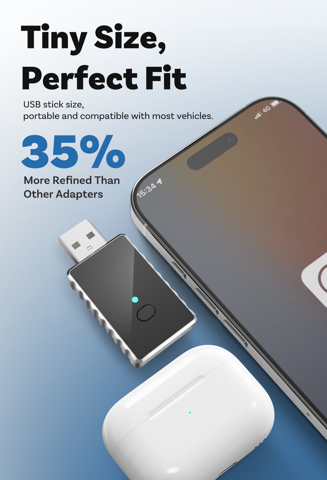 Upgrade your in-car experience with this exquisite Mini Wireless Car Adapter, designed to seamlessly convert your vehicle's factory wired Apple CarPlay and Android Auto to a fully wireless connection. This compact and reliable dongle offers a simple plug-and-play solution, eliminating the need for cumbersome cables. Powered by advanced 5GHz WiFi 6 and Bluetooth 5.4 technology, it provides a fast, stable, and low-latency connection. Its tiny, refined size is 35% smaller than other adapters, ensuring a perfect, unobtrusive fit in your car's USB port. Once set up, your phone will automatically connect each time you start the car, unlocking the full native experience of your infotainment system wirelessly.