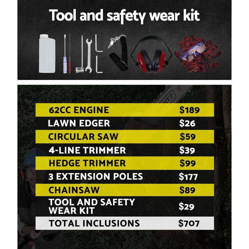So hesitate no more. Lay your hands on some serious tools to get your garden into tip-top shape with the GIANTZ Multi-tool Gardener that comes loaded with a bonus accessory kit, including gloves, earmuffs, mini toolkit, and fuel mixer.