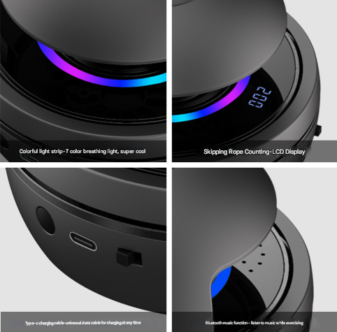 - Functions: Automatic Rope Rotation, Jump Counting, Bluetooth Speaker, Adjustable Speed, LED Lights
