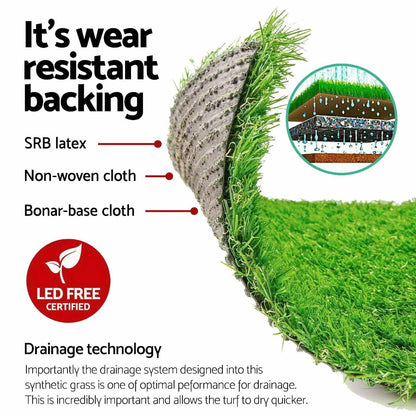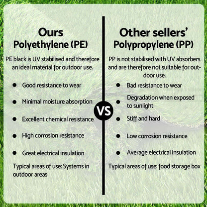 The material used to manufacture the turf is chosen for its excellent properties, such as good resistance to wear, minimal moisture absorption and great electrical insulation to name a few. Nothing like those cheaper alternatives that compromise on quality to sell cheaper. Equally important, the backing of the turf encourages quick drainage and holds fast to the ground, even without any taping.