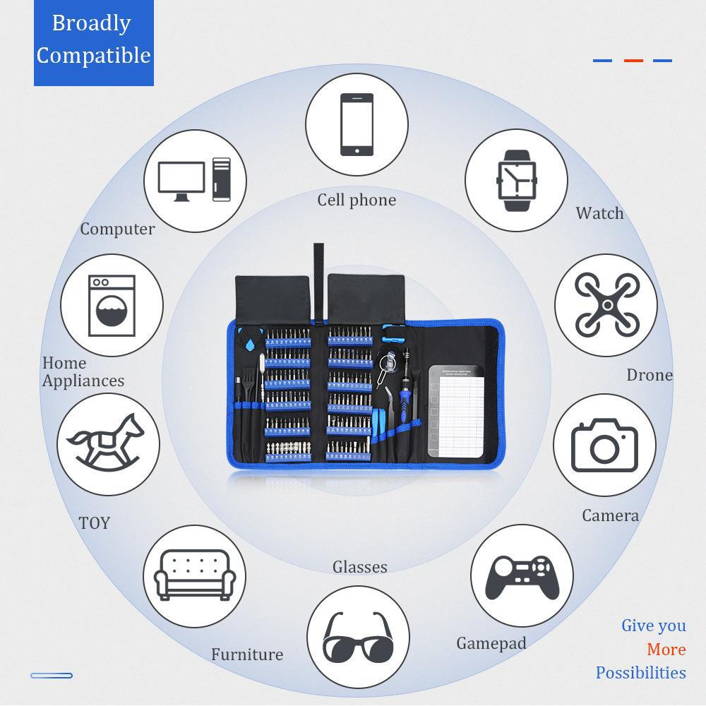 Equip yourself for any precision task with our comprehensive 130-in-1 Precision Screwdriver Repair Tool Kit. This all-inclusive set is broadly compatible with a wide range of devices, making it perfect for repairing computers, cell phones, watches, drones, cameras, home appliances, toys, furniture, and glasses. The kit includes a vast selection of high-quality screwdriver bits, an ergonomic non-slip handle, and a variety of essential accessories such as a flexible extension shaft, tweezers, pry tools, and a magnetic screw memory mat. All components are neatly organized in a durable, portable Oxford cloth bag, ensuring your tools are protected and easy to carry.