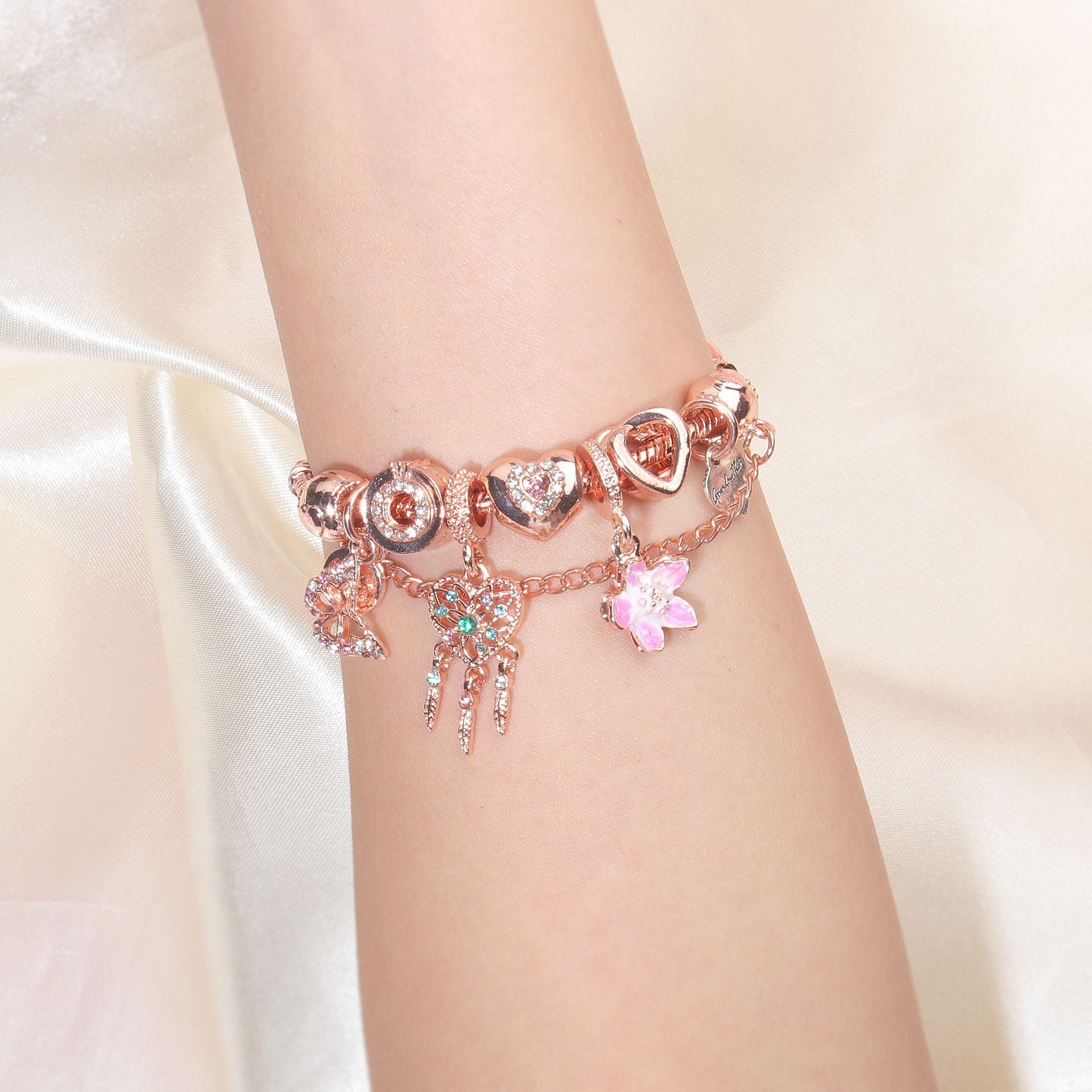Rose Gold Bracelet with Dreamcatcher & Lily Pendant, Crystal Zircon Beads(17cm)
