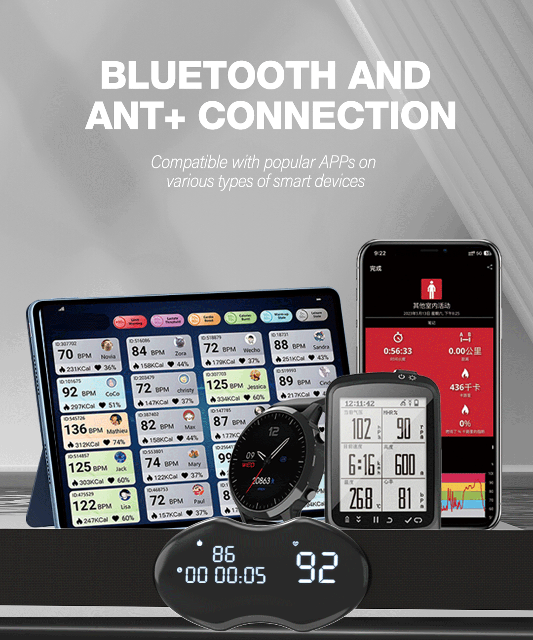 - Transmission Distance: ANT+ up to 10m, BLE up to 40m