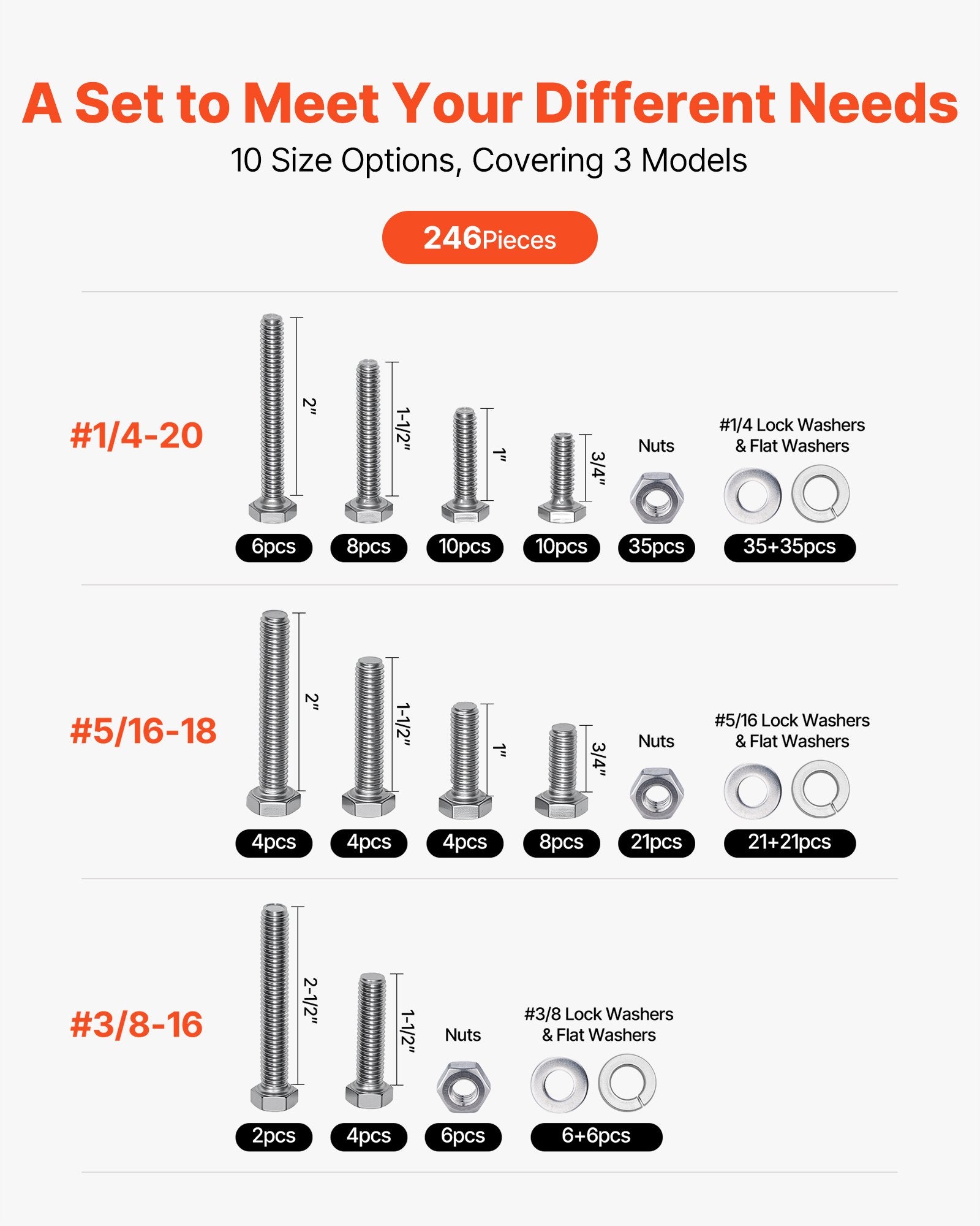 VEVOR 246 Pcs Bolts and Nuts Assortment Kit, Imperial Screws and Flat Washers, Stainless Steel 1/4-20,5/16-18,3/8-16, Spring Lock Washers for Furniture / Equipment /Vehicle Assembly with Case