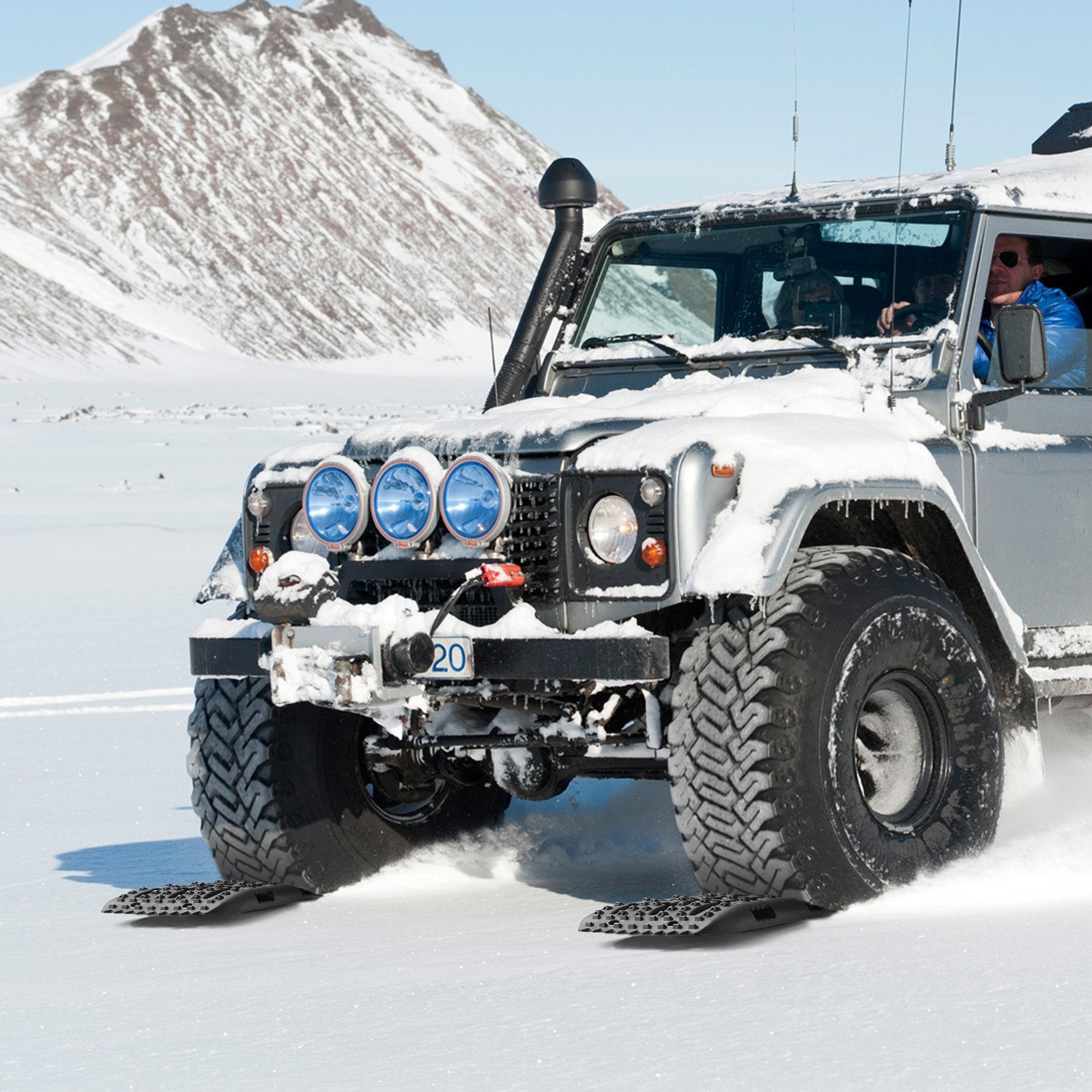 The recovery traction mats have sloped ends that can double as shovels to easily clear sand or snow from the tires. The sloped design facilitates tire engagement and traction. Equipped with two pull straps, it is easy to pick up and deploy. Simply place the board under the wheels and follow the instructions to help your vehicle escape from mud, sand, or snow.