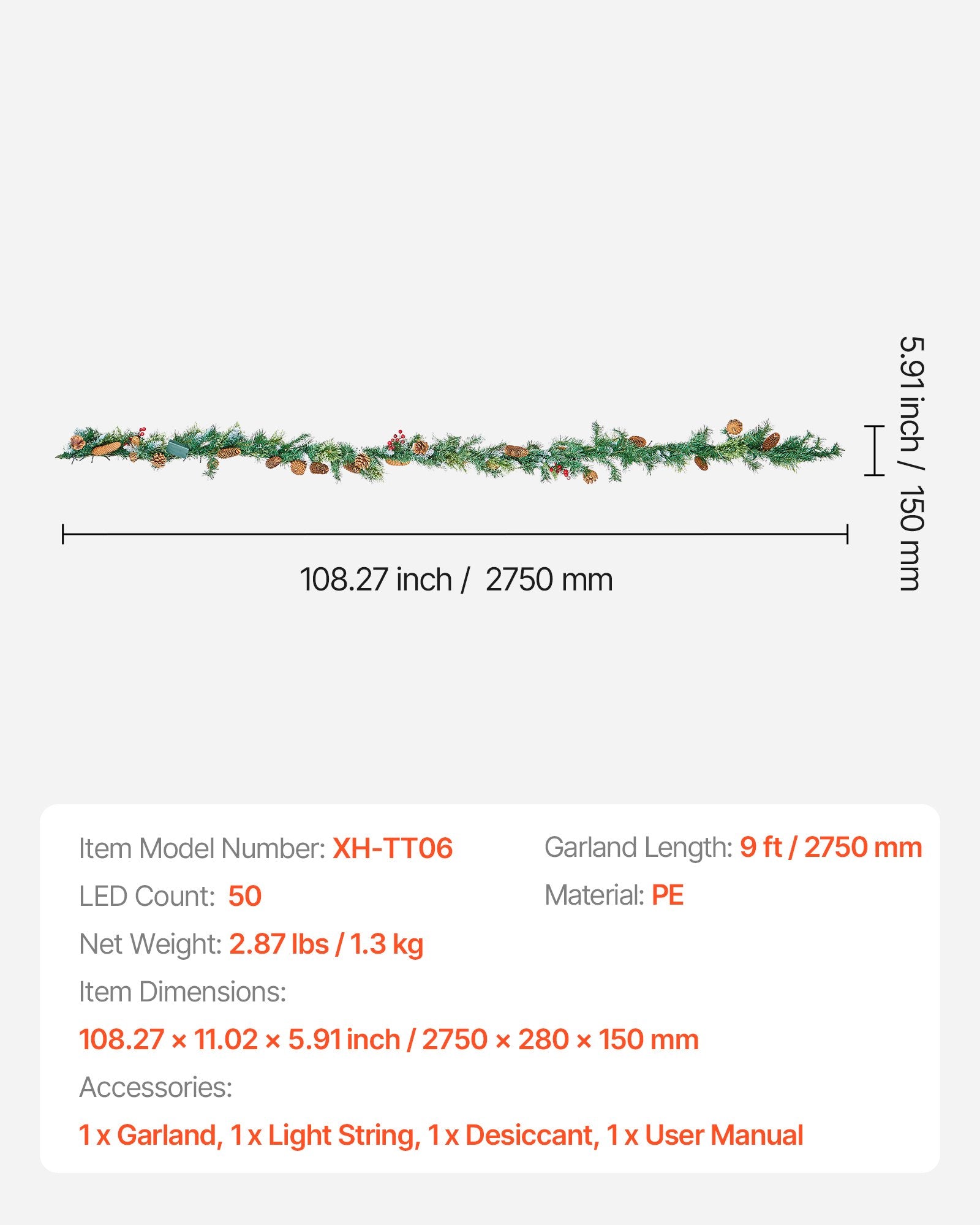 This 9-foot Christmas garland features a realistic mix of pine needles, 4 round pine cones, 9 long pine cones, and 4 berry clusters, creating a full, lifelike look that brings the beauty of nature into your home