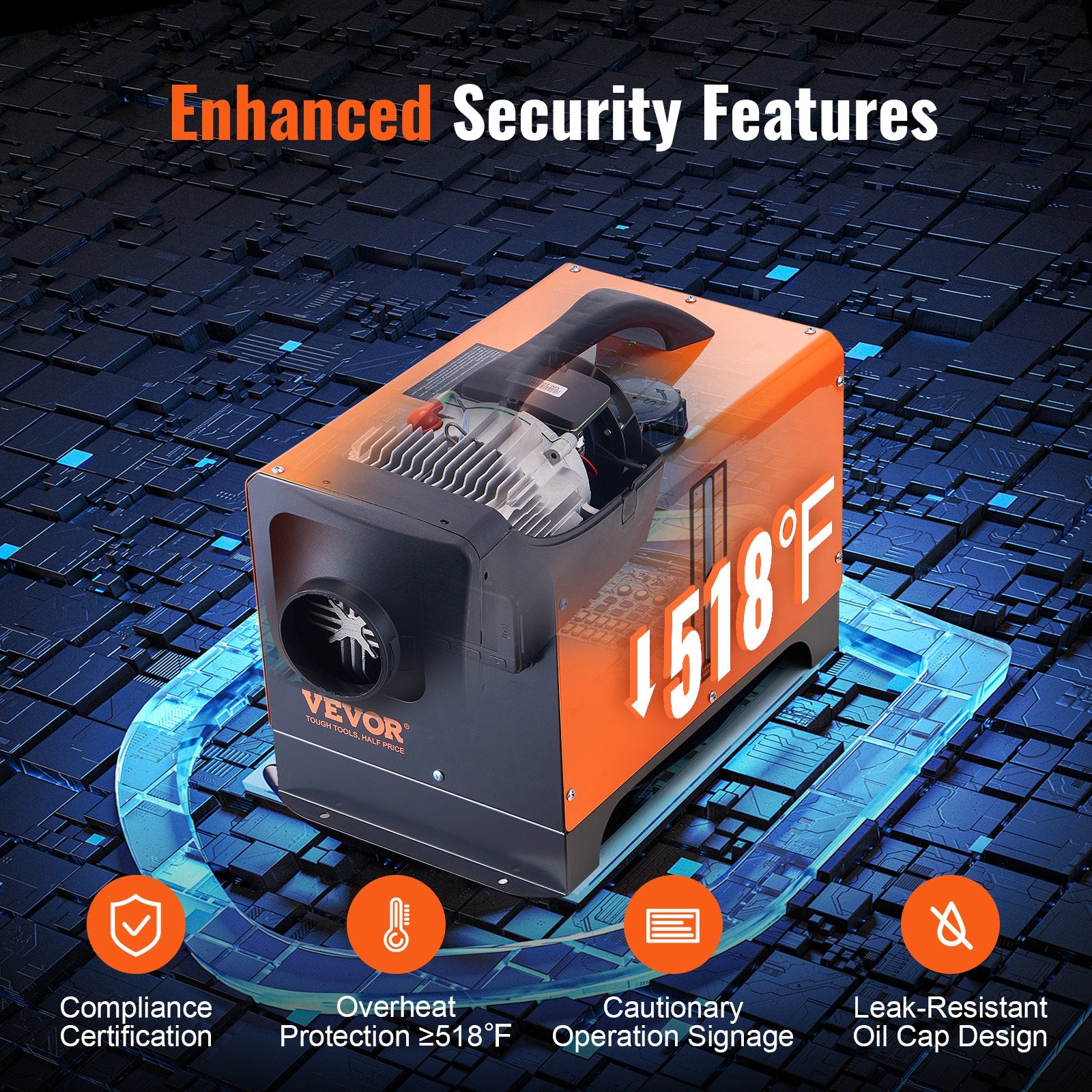 Our diesel heater 8kw is suitable for altitudes below 9843 feet/3000 m and operates smoothly in surrounding temperatures ranging from -104 °F to 104 °F/-40 °C to 40 °C. Whether in high-altitude or low-temperature areas, this portable diesel heater can provide continuous warmth wherever you go.