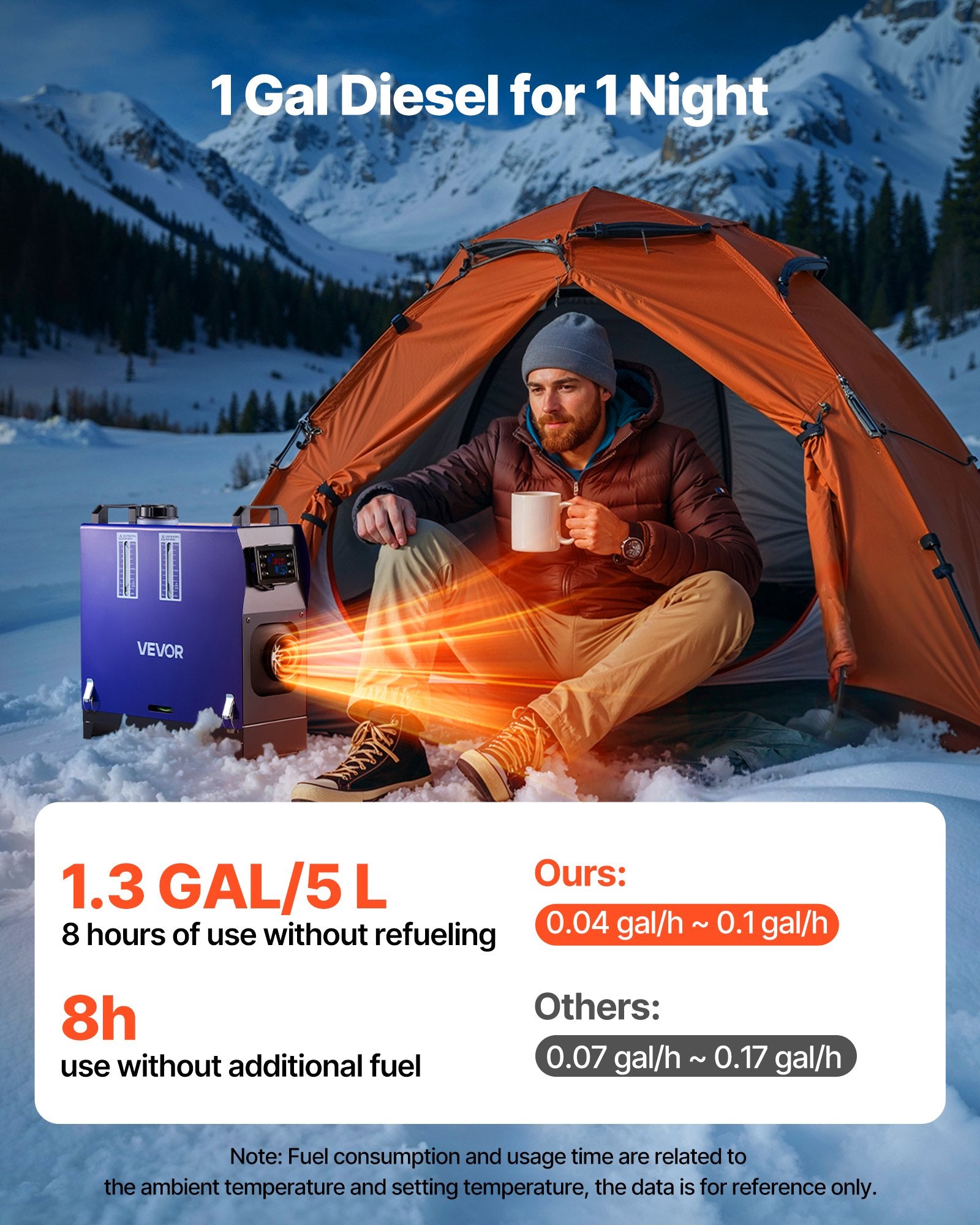 This portable diesel heater features a quiet, energy-saving fuel pump and burns 0.04–0.1 gal/h with over 90% efficiency. The 1.3 gal fuel tank supports all-night heating without refueling, reducing fuel use and energy waste