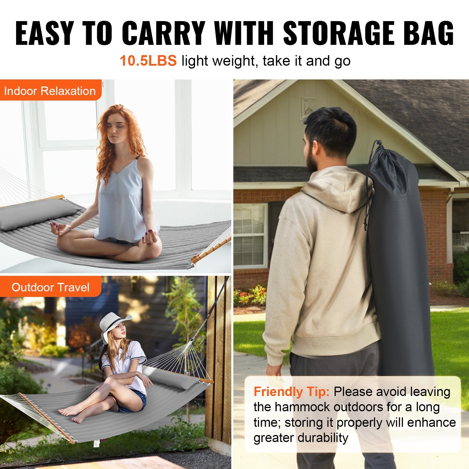 VEVOR Double Quilted Fabric Hammock, 12 FT Double Hammock with Hardwood Spreader Bars, 2 Person Quilted Hammock with Detachable Pillow and Chains for Camping Outdoor Patio Yard Beach, 480 lbs Capacity