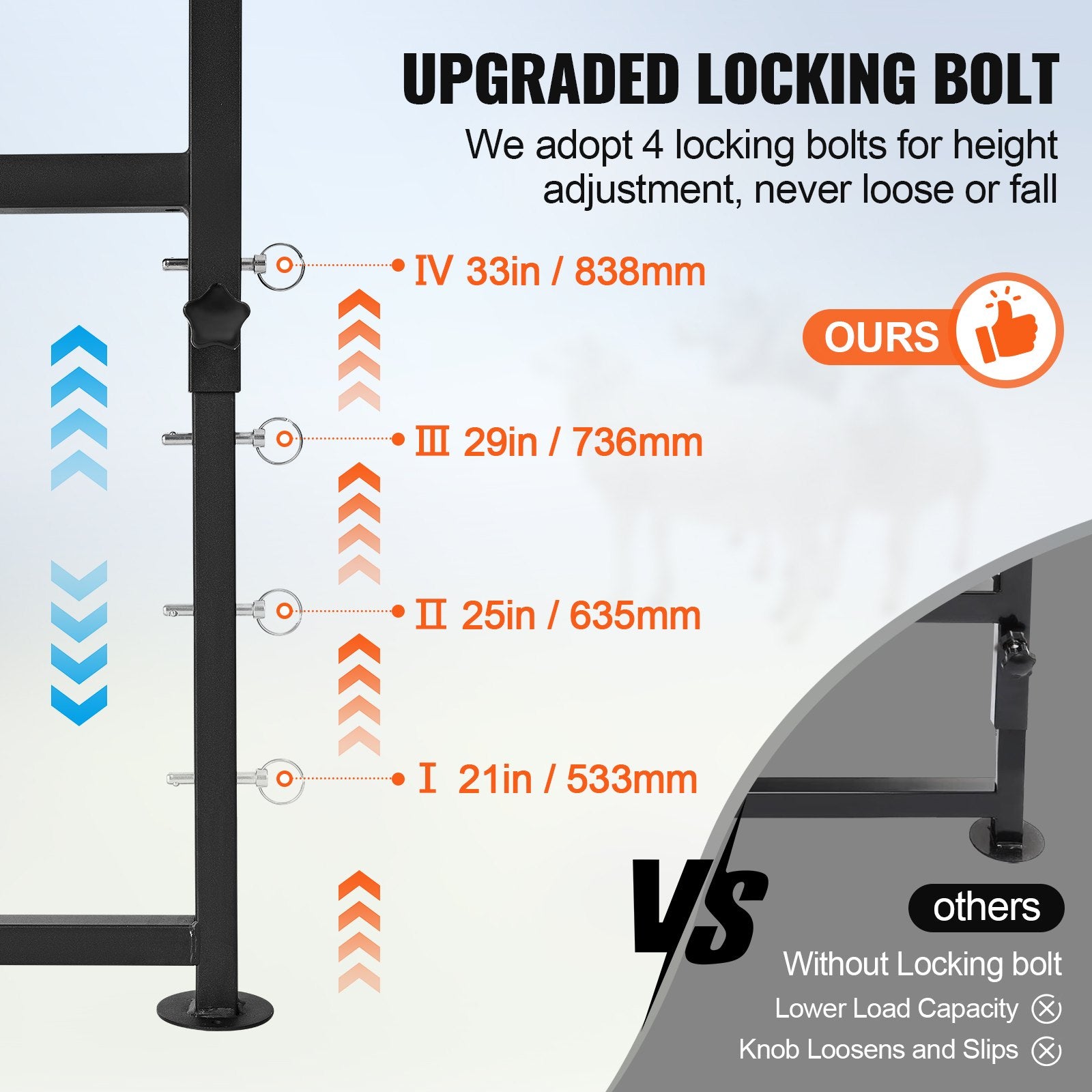 The unique pin design offers four adjustable height options, ranging from 21" to 33", catering to animals of different sizes. Reinforced uprights with a triangular frame enhance loading capacity, ensuring safety and stability.
