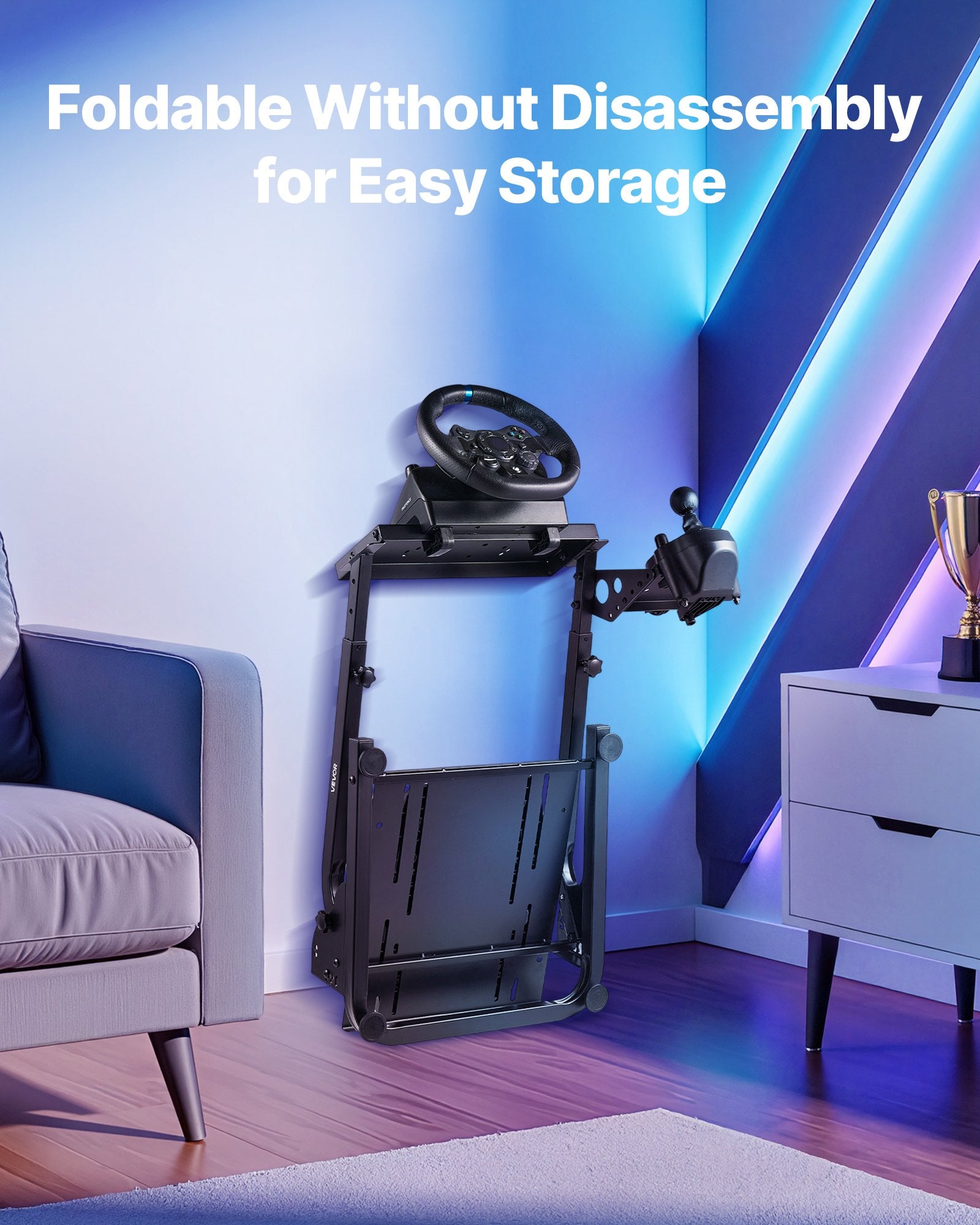 This racing simulator cockpit folds easily without disassembly to save space. Just fold and store it effortlessly. Whether your gaming area is large or small, this racing wheel stand adapts and keeps your setup neat