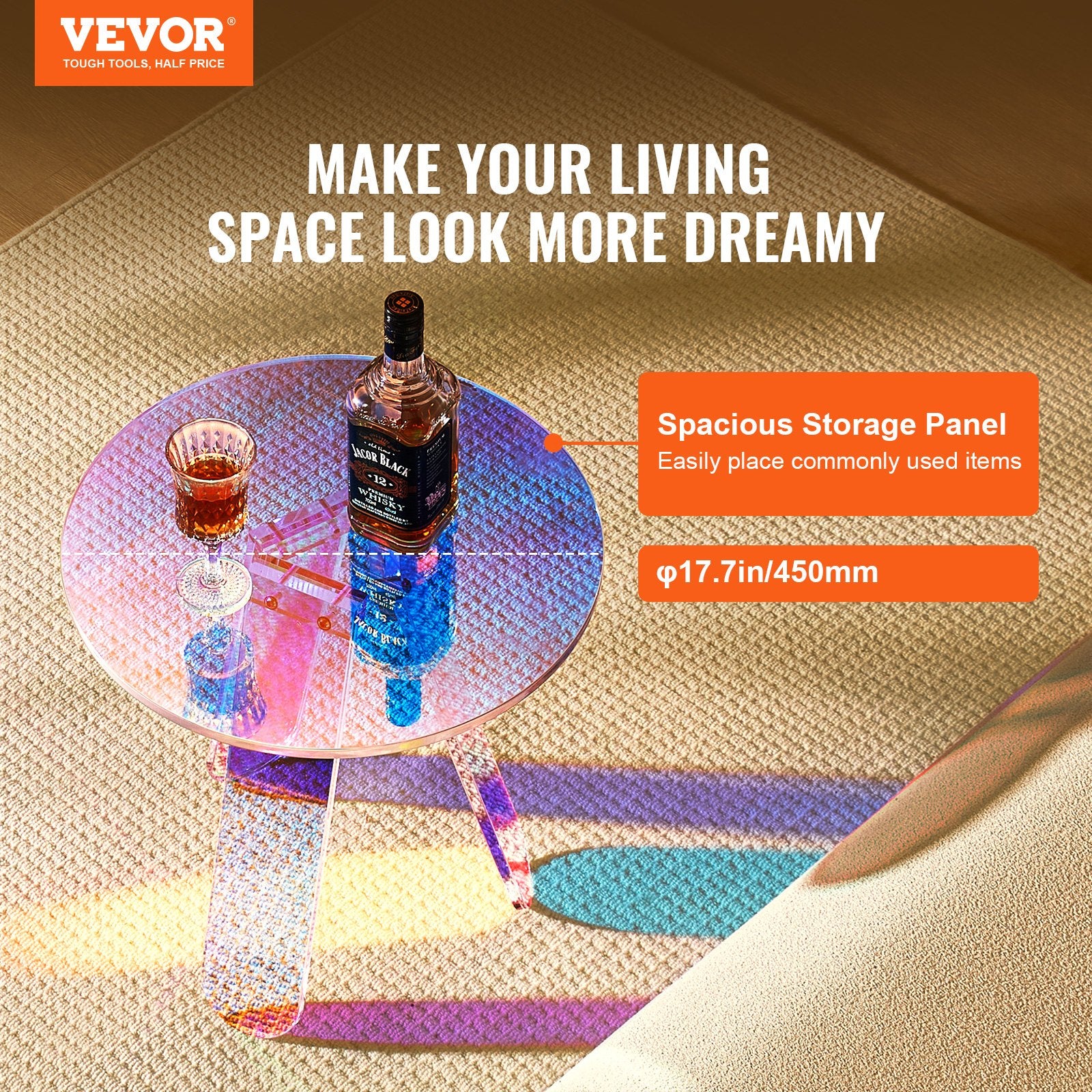 Round Iridescent Side Table, Acrylic End Table, Clear Rainbow Acrylic Coffee Table for Drink, Food, Snack used in Living Room, Bedroom, and Study