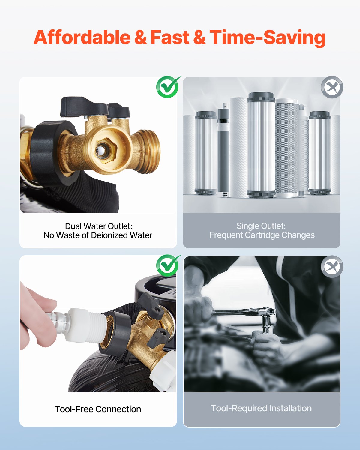 This deionized water system comes with a handheld TDS meter, enabling users to quickly check water quality, replace filter salts when needed, and ensure long-term usage. It also features precise, reliable measurements and excellent environmental adaptability.