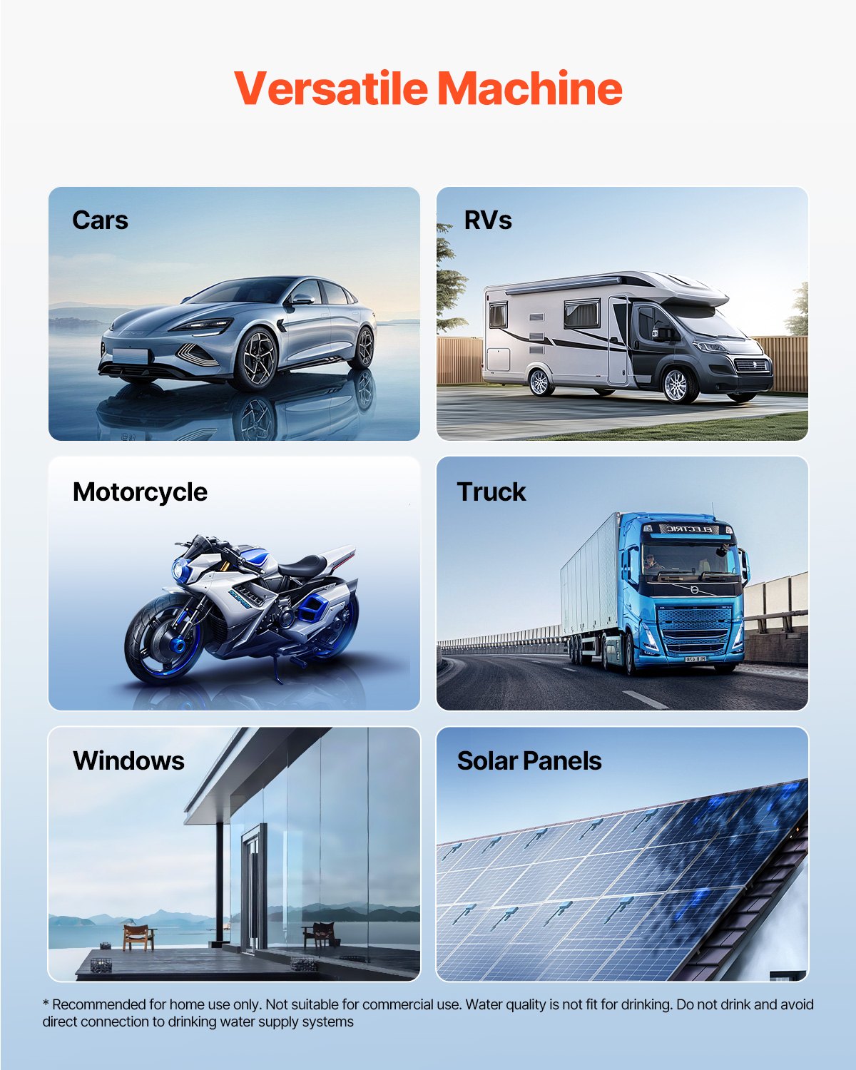 This system is compatible with a wide range of vehicles, including cars, RVs, motorcycles, and trucks, and is also suitable for home windows and renewable energy applications, such as cleaning solar panels.