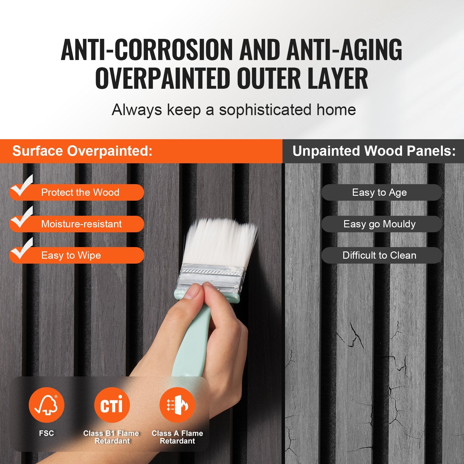 The outer layer is treated with a corrosion-resistant, anti-aging finish that complies with FSC and B1 fire safety standards. This not only enhances the wood's durability but also provides excellent safety for your home, making daily cleaning a breeze.