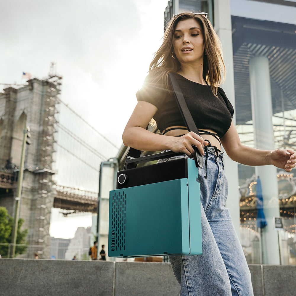 Victrola Revolution Go Turntable - Blue + Entertainment Stand Bundle - Black - Introducing the award-winning Victrola Revolution GO, the world's pioneering portable, rechargeable Bluetooth record player. With its battery-powered design, the Revolution GO lets you enjoy your vinyl collection wherever you go.