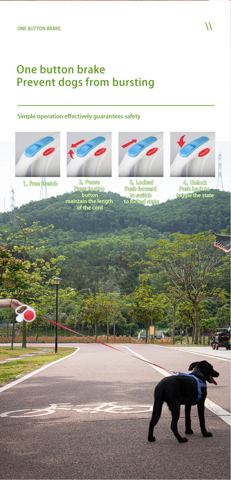 Enjoy safe and controlled dog walks with our retractable leash. The one-hand braking system gives you instant control, making it perfect for navigating busy streets or open parks. This leash allows your dog freedom to explore, while ensuring you maintain a secure and responsive connection.