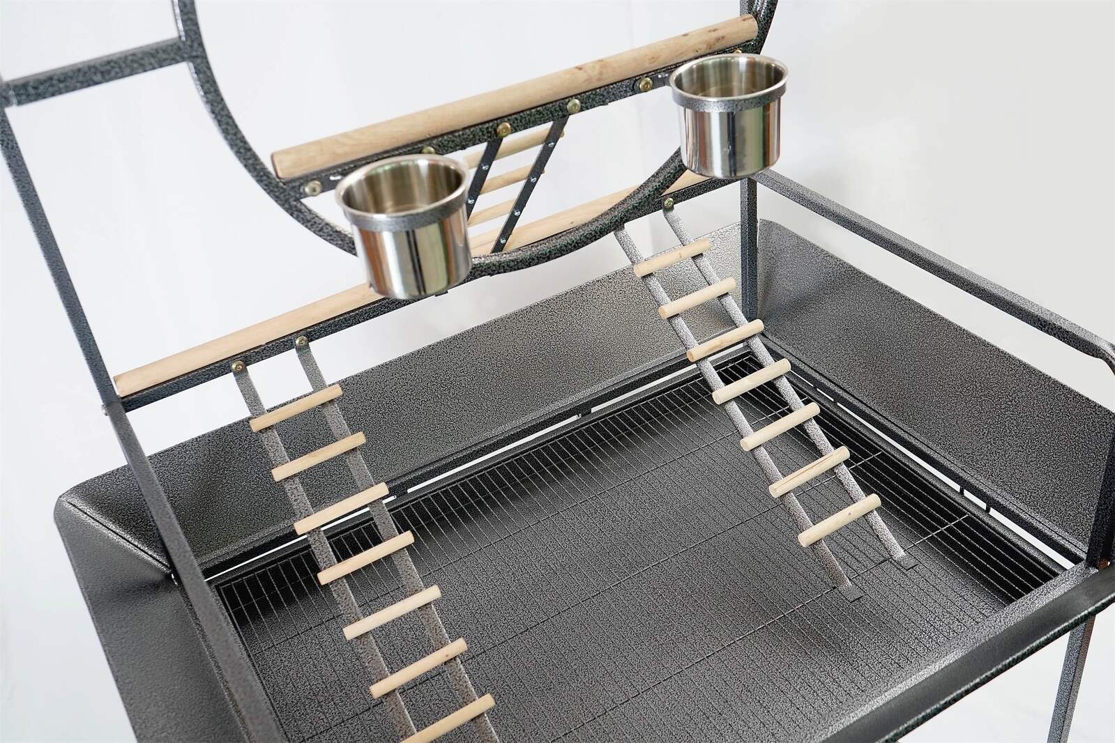 - Metal play ring in center, multiple wooden perches for resting plus 2 stainless steel bowls for food and water